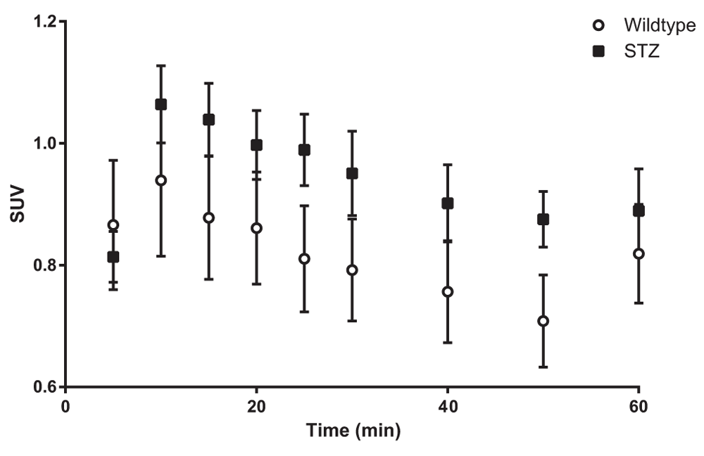 TACs are expressed as SUVs from regions corresponding to regions of interest from six image slices corresponding to the pancreas. Values are means ± SEM (n=4). There were no significant differences at any of the time points.