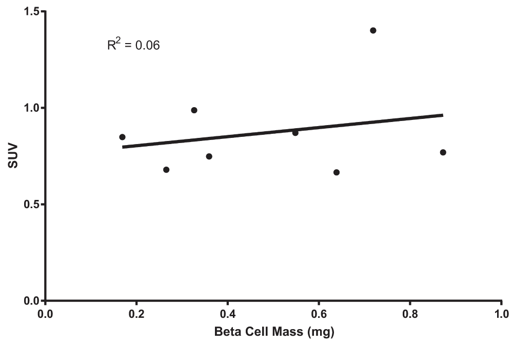 SUVs from static scans from both wt and STZ-treated mice were plotted as a function of beta cell mass. Each point represents values from individual mice. Linear regression analysis showed no significant correlation between SUV and beta cell mass.