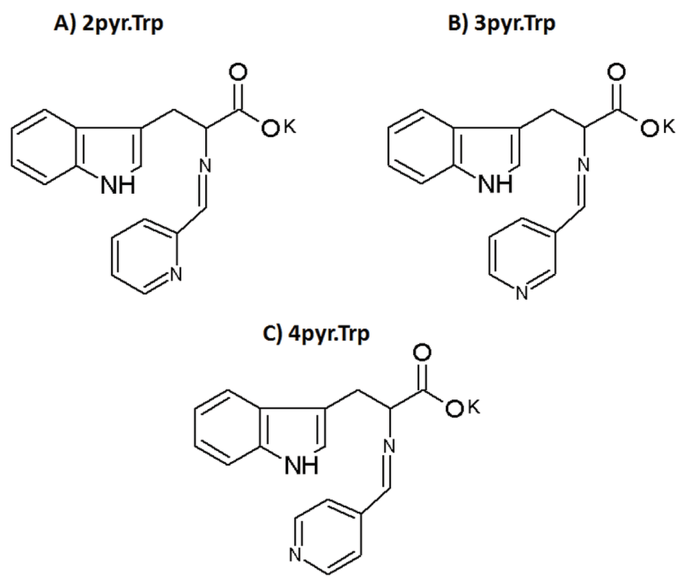 Schiff bases (2pyr.Trp, 3pyr.Trp, and 4pyr.Trp) were synthesized by condensation of potassium salt of L-tryptophan and isomeric (2-, 3-, 4-) pyridinecarboxaldehydes, respectively, in alcohol solutions (ethanol, methanol) in 5°C–25°C temperature range and 1:1 molar ratio. First, 10 mM of L-tryptophan was dissolved in 100 mL of alcohol solution, containing KOH (10mM) by permanent stirring under dry nitrogen at 18°C–20°C. Then 10 mM of the corresponding isomer of pyridincarboxyaldehyde (2-, 3- or 4-) was added to the resulting solution with stirring and refluxed at 50°C for 2 hours resulting in a yellow colored solution that indicates the Schiff base formation. The volume of the solution was then reduced in vacuo using a rotary evaporator. Anhydrous ether was added to deposit a yellowish precipitate, which was then re-crystallized from alcohol.