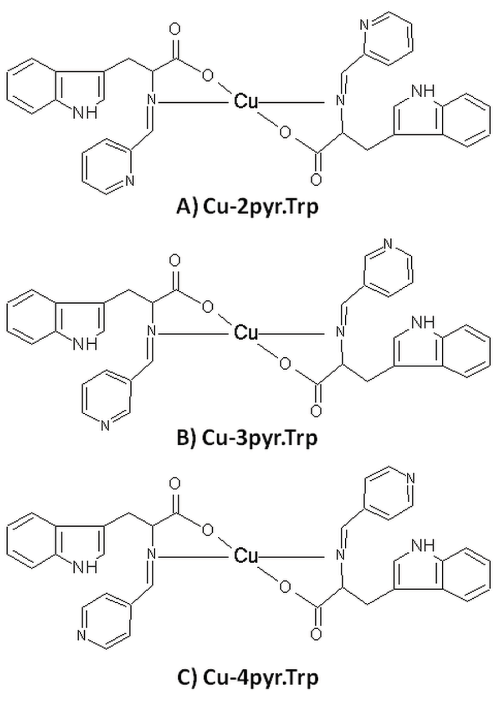 Suggested structure of Cu-2pyr.Trp (A), Cu-3pyr.Trp (B), Cu-4pyr.Trp (C) metallocomplexes.