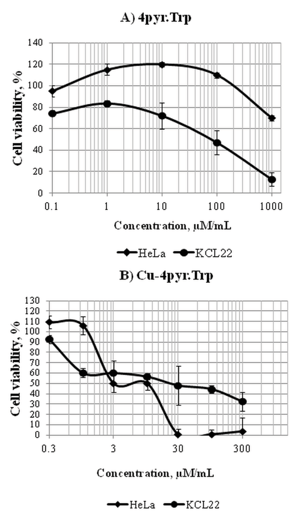 The cytotoxicity of 4pyr.Trp (A) and Cu-4pyr.Trp (B) in HeLa and KCL-22 cell lines. Dose-response curves were obtained after 48 hours of treatment with Schiff base 4pyr.Trp and its copper(II) complex Cu-4pyr.Trp at the concentration range of 0.1–1000 µM/mL. Cell viability was expressed as a percentage of the negative control (cell cultures with no treatment). Doses inducing 50% inhibition of cell viability (the IC50 value) were calculated to determine the cytotoxicity of 4pyr.Trp and Cu-4pyr.Trp. The IC50 value estimated for 4pyr.Trp in KCL-22 cell line was equal to 100±6.5 μM/mL, whereas the viability of HeLa cells was more than 60% at the highest concentration tested (A). The IC50 values estimated for Cu-4pyr.Trp were equal to 10±5 μM/mL and 30±3.8 μM/mL for HeLa and KCL-22 cell lines, respectively (B).