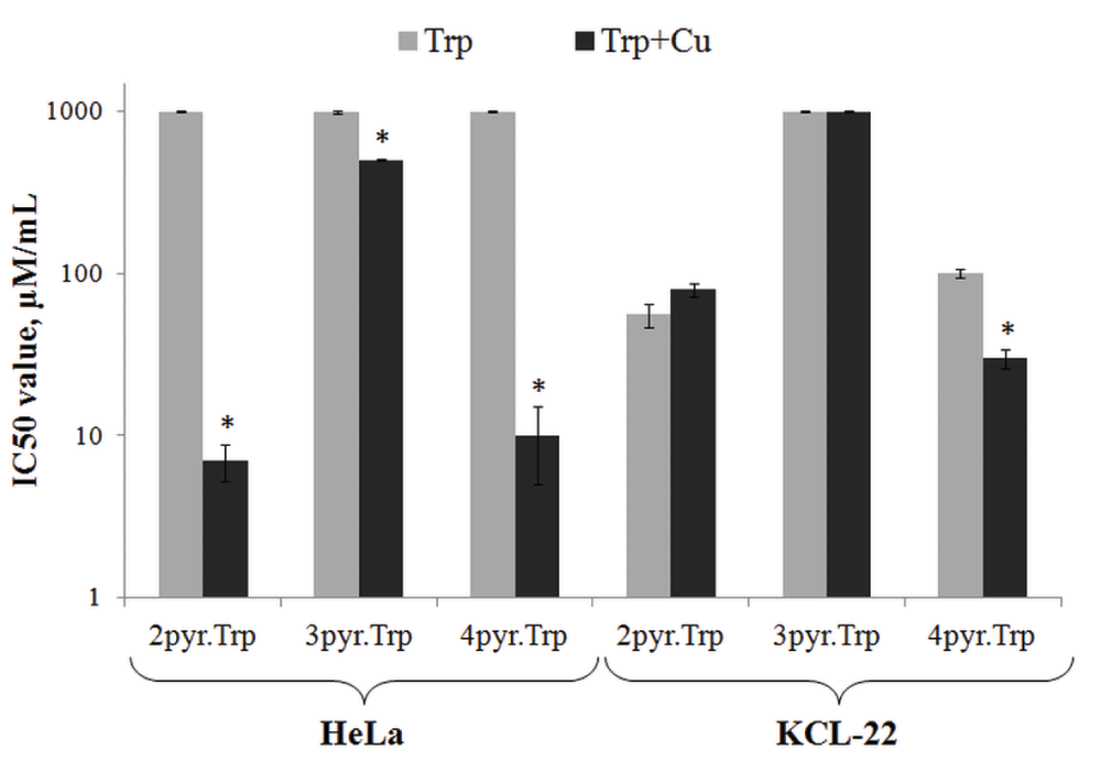 The cytotoxic activity was observed for Cu-2pyr.Trp, Cu-3pyr.Trp and Cu-4pyr.Trp in HeLa cell line with the IC50 values of 7±1.7 μM/mL, 500±5.6 μM/mL and 10±5.0 μM/mL, respectively. Those IC50 values were significantly lower in comparison with their copper free analogs. The same tendency was demonstrated for Cu-4pyr.Trp in KCL-22 cell line, where the IC50 value decreased up to 30±3.7 μM/mL. In case of Cu-2pyr.Trp and Cu-3pyr.Trp complexes tested in KCL-22 cell line, no significant differences in IC50 values were observed in comparison with their copper free analogs. Thus, it can be assumed that the cytotoxic activity of Schiff bases tends to increase at complex formation with the copper molecule (Figure 6).