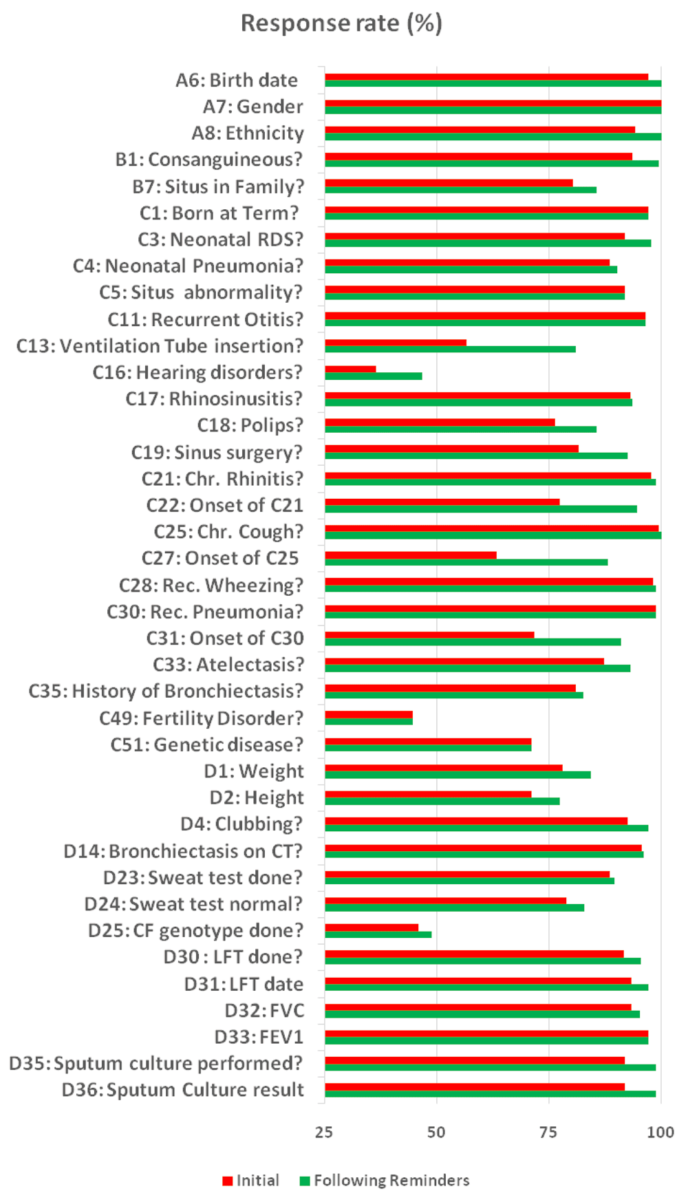 Five uncompleted yet relevant items had non-response rates between 25–50%. For example, one item enquired whether the patient had family members who suffered from any of 12 various symptoms. Although the symptoms were specific (e.g., chronic rhinitis, fertility disorders), patients may not have known their family history to that degree of detail or the information may not have been entered in the chart. Other questions with low response rate asked for the results of specific tests such as the sweat chloride concentration. If this information was not readily available from the chart or from the patient, this question would not have been answered.