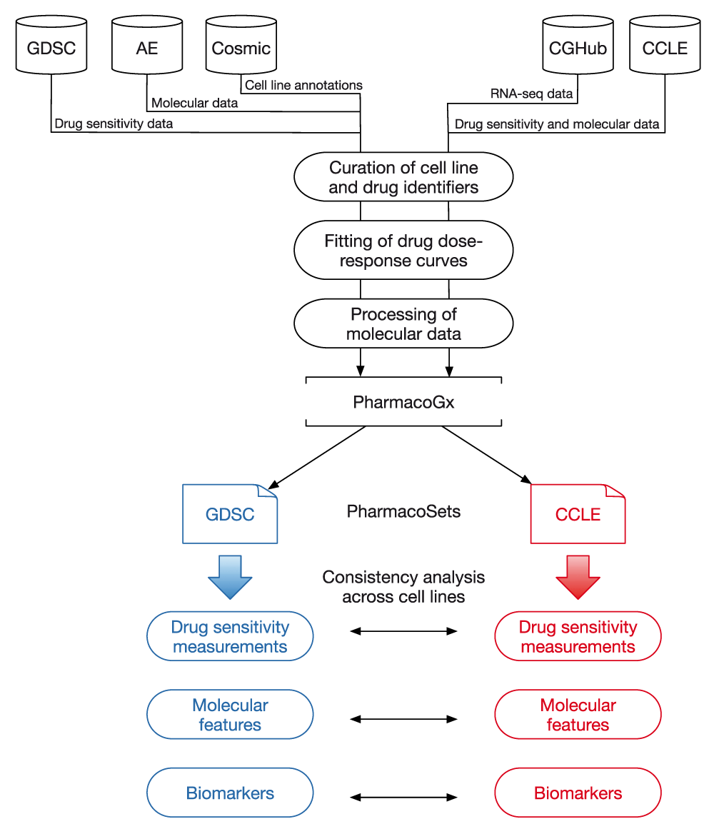 The lack of standardization of cell line and drug identifiers hinders comparison of molecular and pharmacological data between large-scale pharmacogenomic studies, such as the GDSC and CCLE. To address this issue we developed PharmacoGx, a computational platform enabling users to download and interrogate large pharmacogenomic datasets that were extensively curated to ensure maximum overlap and consistency11. PharmacoGx provides (i) a new object class, called PharmacoSet, that acts as a container for the high-throughput pharmacological and molecular data generated in large pharmacogenomics studies (detailed structure provided in Supplementary Methods); and (ii) a set of parallelized functions to assess the reproducibility of pharmacological and molecular data and to identify molecular features associated with drug effects. The PharmacoGx package is open-source and publicly available on Bioconductor.