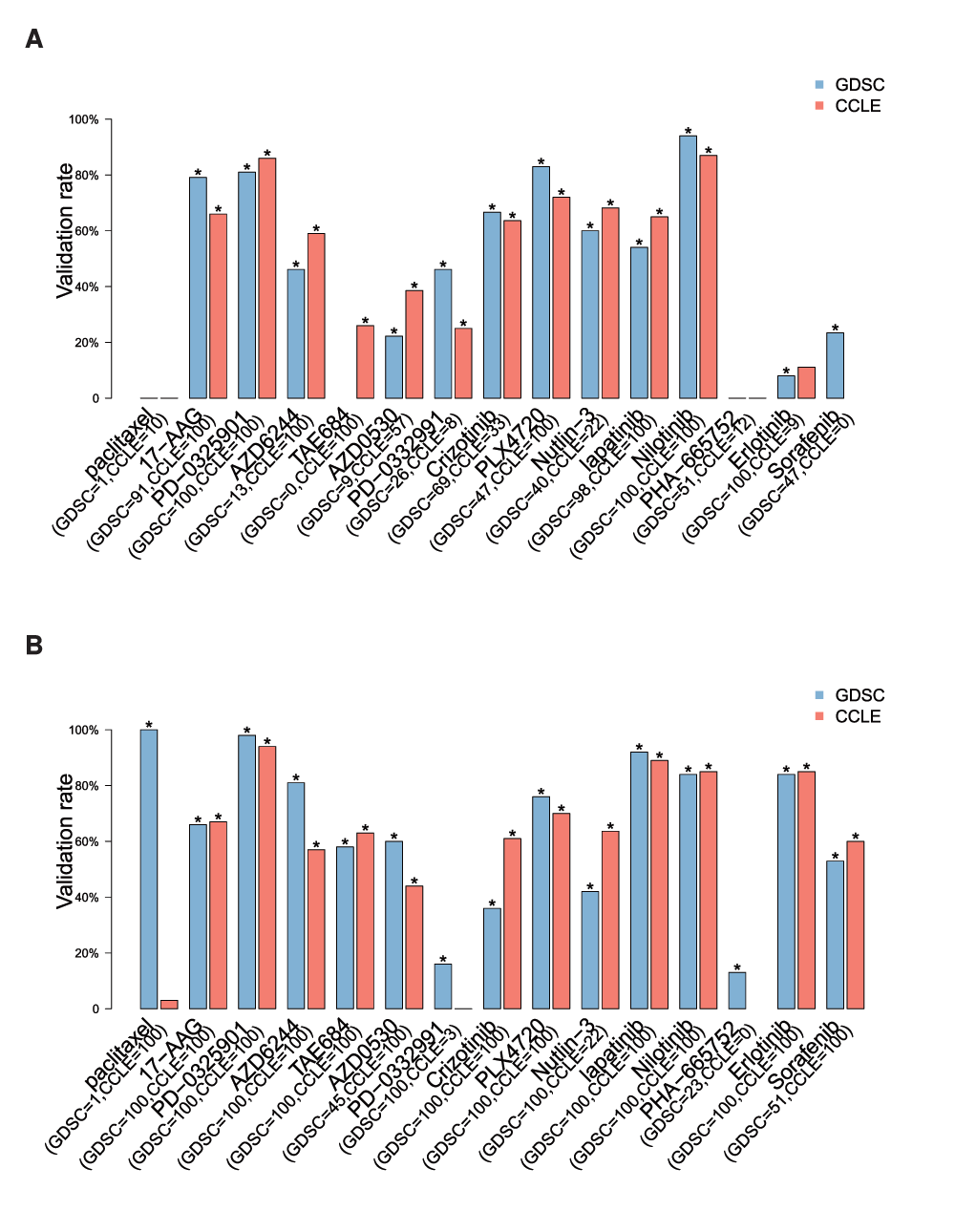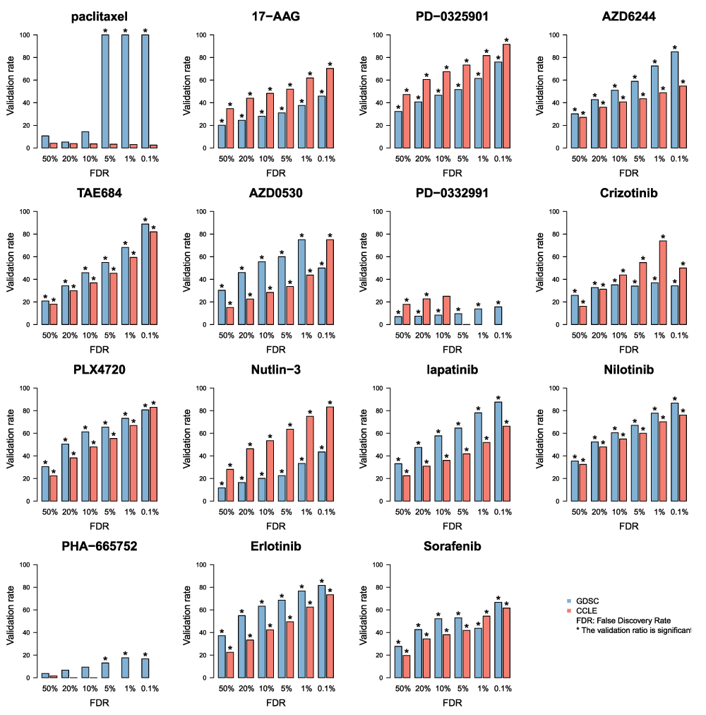 We computed the proportions of validated gene-drug associations for each drug using gene expression data in GDSC as discovery set and CCLE as validation set, and vice versa (Figure 10). Overall, we found that biomarkers for PD-0325901 and nilotinib yielded a high validation rate (> 80%) with either dataset as discovery set using the common cell lines screened in GDSC and CCLE (Figure 10A). When using the entire cell line panels used in each study, two more drugs -- lapatinib and erlotinib -- yielded high validation rate (Figure 10B). 17-AAG, and PLX4720 yielded validation rate between 60% and 80%, while the other drugs yielded a validation rate around 50% or lower. For eight out of the fifteen drugs, using the entire panel of cell lines screened in each study (Figure 10B) improved the validation rate compared to limiting the analysis to common cell lines (Figure 10A). However validation rate decreased for five other drugs, suggesting that using large, but different panels of cell lines may increase statistical power but could also introduce biases in the biomarker discovery process.