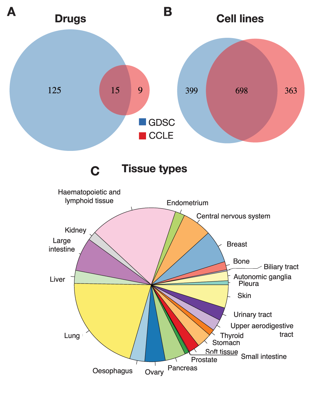 To identify the largest set of cell lines and drugs profiled by both GDSC and CCLE, we used the PharmacoGx computational platform11 that is able to store, analyze, and compare curated pharmacogenomic datasets. We created curated datasets for the new releases of the GDSC (July 2015) and CCLE (February 2015) projects. The improved curation of new data using PharmacoGx11 identified 15 drugs in common between GDSC and CCLE as well 698 cell lines, originating from 23 tissue types (Figure 2). This is the same number of shared drugs but the updated datasets contains a larger number of common cell lines than the 471 reported in our previous analysis7.