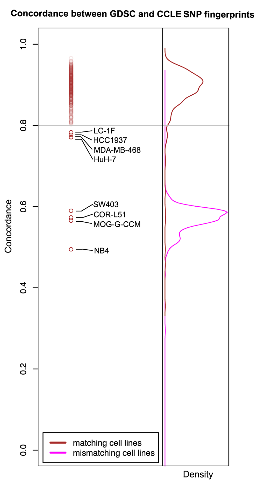 To assess the identity of cell lines from GDSC and CCLE, data of low quality were first excluded from our analysis panel (detailed procedure described in Supplementary Methods). Of the 973 CEL files from GDSC, only 66 fell below the 0.4 threshold (6.88%) for contrast QC scores, indicating issues in resolving base calls. Additionally, five of the 1,190 CEL files from CCLE had an absolute difference between contrast QC scores for Nsp and Sty fragments greater than 2, thus indicating some issues with the efficacy of one enzyme set during sample preparation. CEL files with contrast QC scores indicative of some sort of issue with the assay that would affect the genotype call rate or birdseed accuracy were removed and genotype calling was conducted on the remaining CEL files using Birdseed version 2. The resulting files were then filtered to keep only the 1006 SNP fingerprints that originated from CEL files that had a common cell line annotation between GDSC and CCLE (503 CEL files from each). Finally, pairwise concordances of all SNP fingerprints were generated according to the method outlined by Hong et al.12.