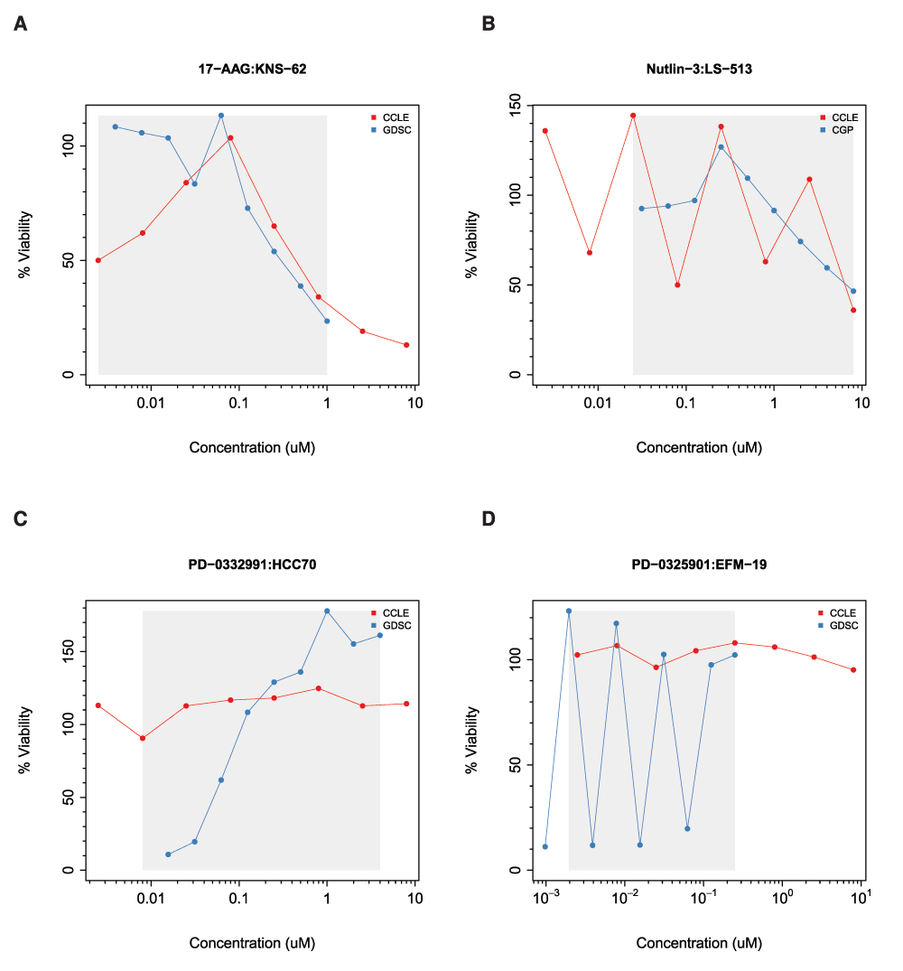 The grey area represents the common concentration range between studies. (A) JNS-62 cell line treated with 17-AAG; (B) LS-513 treated with nutlin-3; (C) HCC70 cell lines treated with PD-0332991; and (D) EFM-19 cell line treated with PD-0325901.