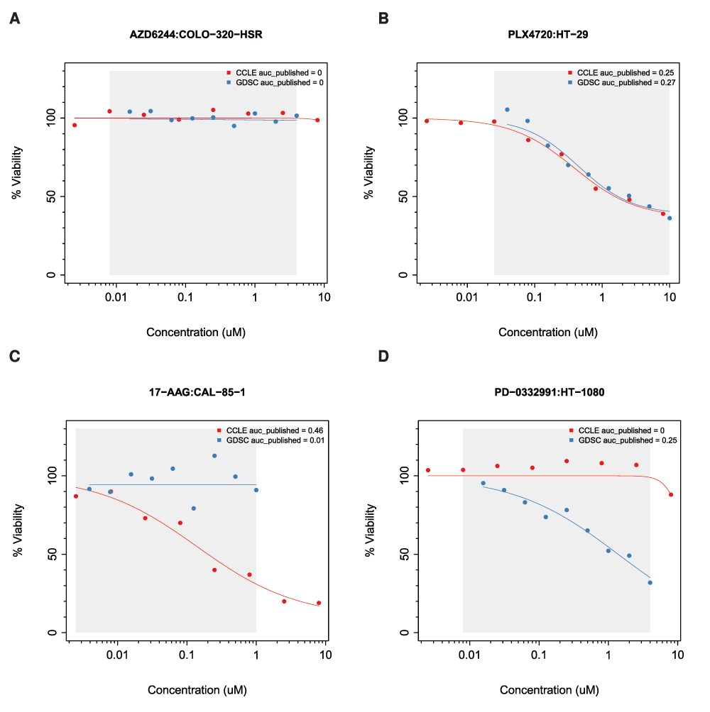 Examples of (A,B) consistent and (C,D) inconsistent drug dose-response curves in GDSC and CCLE. The grey area represents the common concentration range between studies. (A) COLO-320-HSR cell line treated with AZD6244; (B) HT-29 treated with PLX4720; (C) CAL-85-1 cell lines treated with 17-AAG; and (D) HT-1080 cell line treated with PD-0332991.