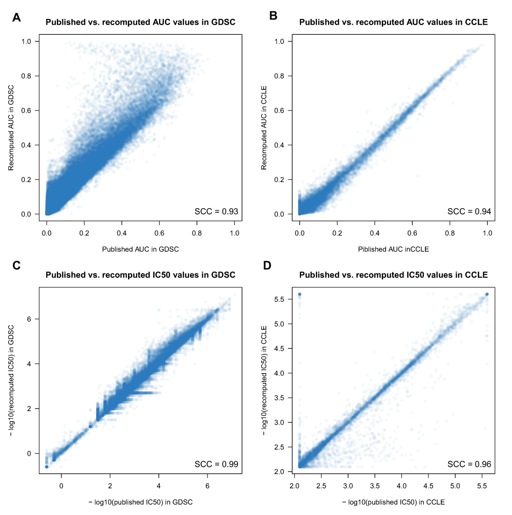 Although the ABC values provide a measure of the degree of consistency between studies, it is the AUC and IC50 estimates, and their correlation with molecular features (such as mutational status and gene expression) that are commonly used to assess drug response. Therefore we revisited our comparative analysis of the drug sensitivity data using the expanded data and the standardized methods implemented in our PharmacoGx platform. Using the same three-parameter sigmoid model to fit drug dose-response curves in GDSC and CCLE (see Methods), we recomputed AUC and IC50 values and observed very high correlation between published and recomputed drug sensitivity values for each study individually (Spearman > 0.93; Figure 6; Dataset 2).
