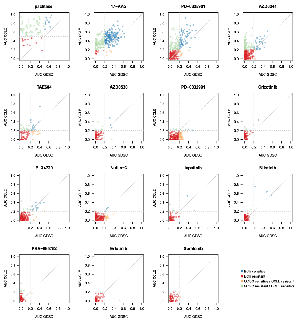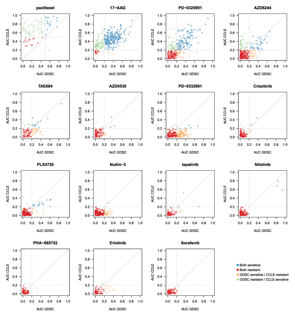 For cytotoxic drugs (paclitaxel), cell lines with AUC < 0.4 were considered as insensitive, while for targeted therapies cell lines with AUC < 0.2 were considered insensitive (grey dashed lines). In case of perfect consistency, all points would lie on the grey diagonal.