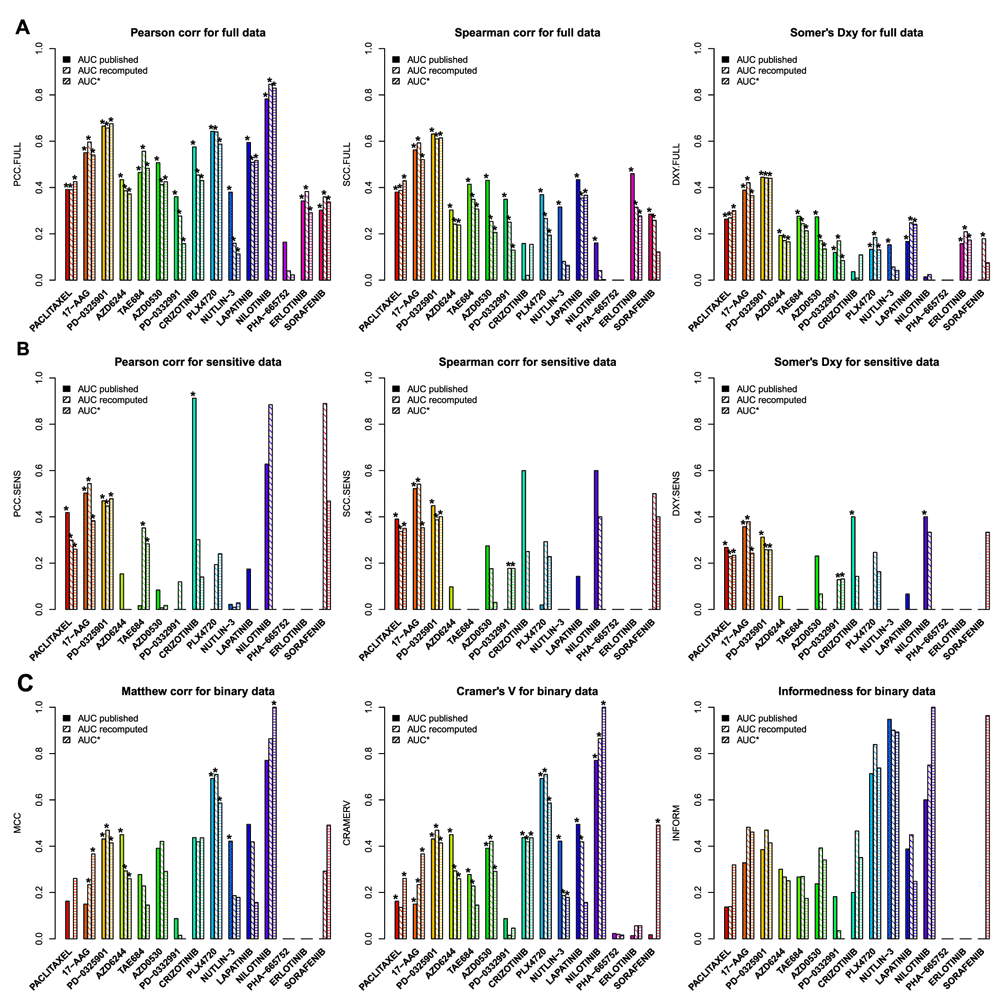 (A) Consistency assessed using the full set of cancer cell lines screened in both studies. (B) Consistency assessed using only sensitive cell lines (AUC ≥ 0.4 for broad effect drugs, and AUC ≥ 0.2 for drugs with narrow effects). (C) Consistently assessed by discretizing the drug sensitivity data using the aforementioned cutoffs for AUC. PCC: Pearson correlation coefficient; SCC: Spearman rank-based correlation coefficient; DXY: Somers’ Dxy rank correlation; MCC: Matthews correlation coefficient; CRAMERV: Cramer’s V statistic; INFORM: Informedness. The symbol '*’ indicates whether the consistency is statistically significant (p< 0.05).
