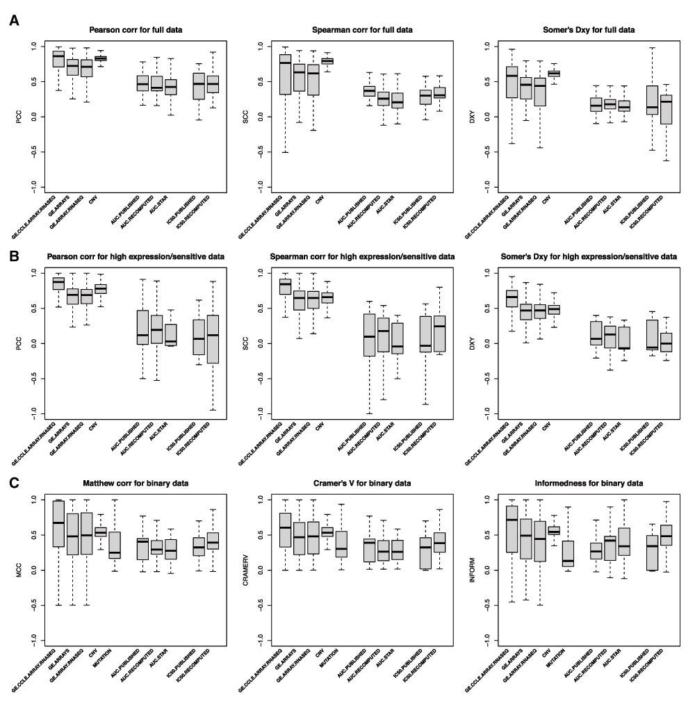 (A) Consistency assessed using the full set of cancer cell lines screened in both studies. (B) Consistency assessed using only sensitive cell lines (AUC ≥ 0.4 for broad effect drugs, and AUC ≥ 0.2 for drugs with narrow effects). (C) Consistently assessed by discretizing the molecular and drug sensitivity data. PCC: Pearson correlation coefficient; SCC: Spearman rank-based correlation coefficient; DXY: Somers’ Dxy rank correlation; MCC: Matthews correlation coefficient; CRAMERV: Cramer’s V statistic; INFORM: Informedness.