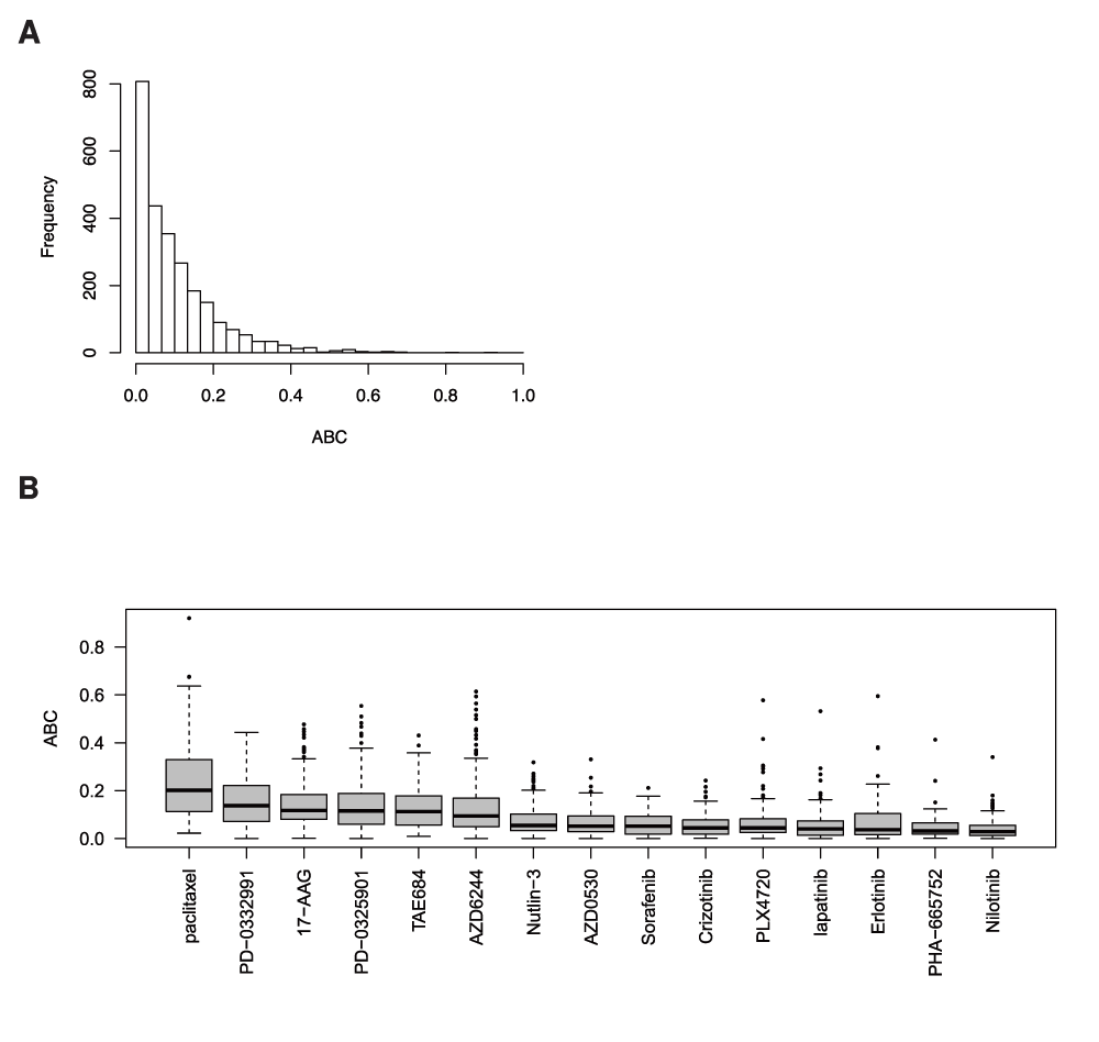 (A) Histogram of ABC estimates for all common drug dose-response curves between GDSC and CCLE. (B) Boxes represent the median and inter quartile range of ABC for drug-cell line combinations screened in GDSC and CCLE.