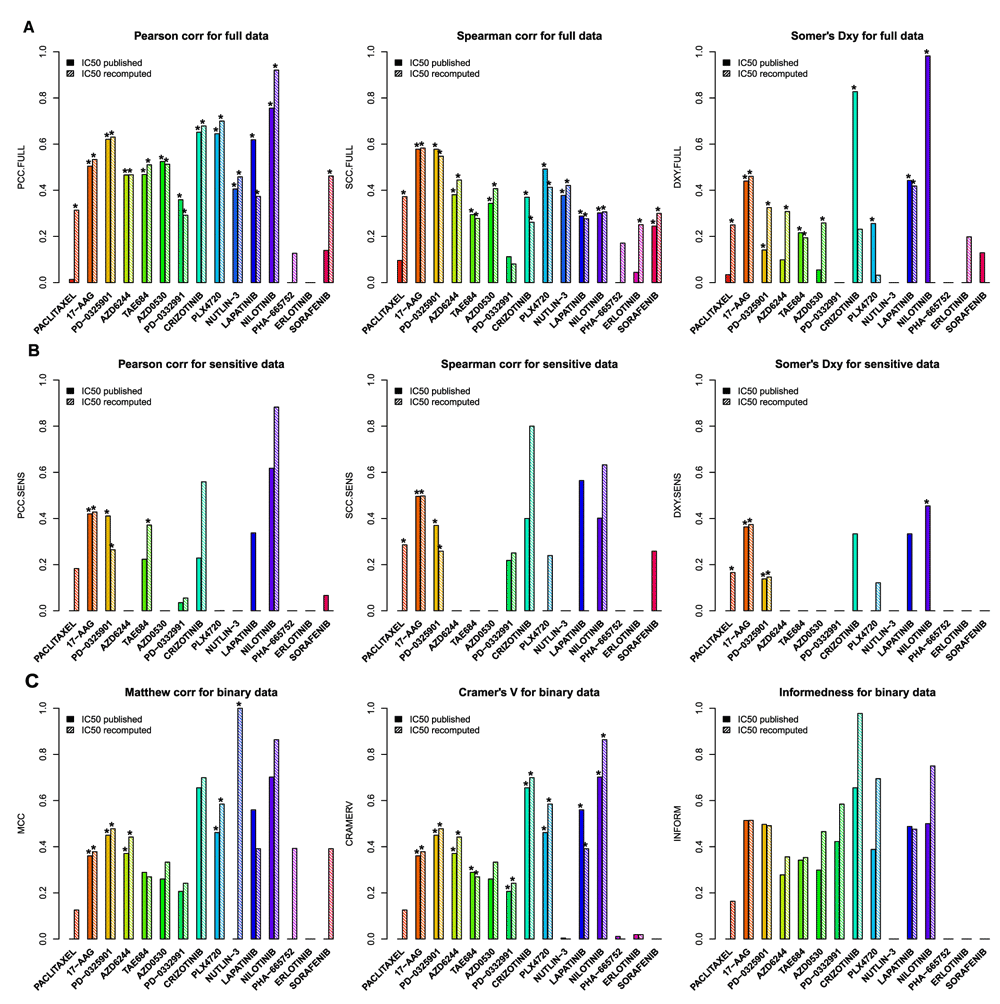 (A) Consistency assessed using the full set of cancer cell lines screened in both studies. (B) Consistency assessed using only sensitive cell lines (IC50 ≥ 10μM for broad effect drugs, and AUC ≥ 1μM for drugs with narrow effects). (C) Consistently assessed by discretizing the drug sensitivity data using the aforementioned cutoffs for IC50. PCC: Pearson correlation coefficient; SCC: Spearman rank-based correlation coefficient; DXY: Somers’ Dxy rank correlation; MCC: Matthews correlation coefficient; CRAMERV: Cramer’s V statistic; INFORM: Informedness. The symbol ’*’ indicates whether the consistency is statistically significant (p< 0.05).