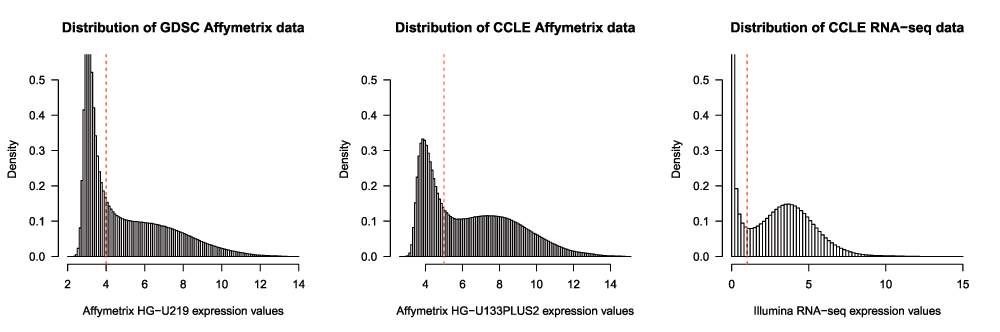 Gene expression data. To discretize the drug sensitivity data into lowly vs. highly expressed genes, we fit a mixture of two Gaussians of unequal variance using the full distribution of expression values of the 17,401 genes in common between GDSC and CCLE datasets. We defined the expression threshold as the expression value for which the posterior probability of belonging to the left tail of the highly expression distribution is 10%.