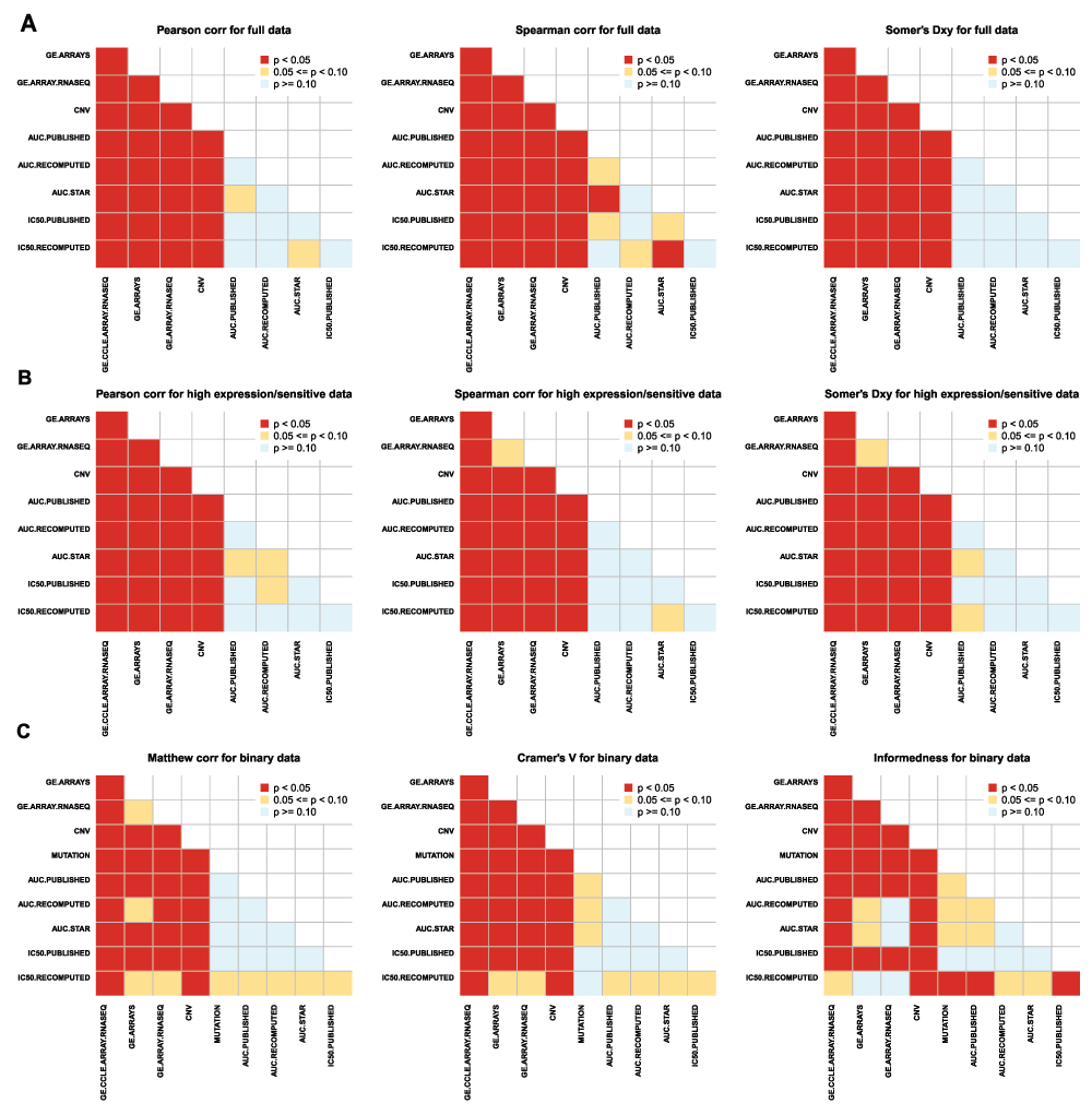 Each cell in the matrix represents the p-value (coded by colour) for a given pairwise comparison of consistency estimates. For instance, consistency of gene expression data is statistically significantly higher than consistency of drug sensitivity data. GE.CCLE.ARRAY.RNASEQ: Consistency between gene expression data generated using Affymetrix HG-U133PLUS2 microarray and Illumina RNA-seq platforms within CCLE; GE.ARRAYS: Consistency between gene expression data generated using Affymetrix HG-U133A and HG-U133PLUS2 microarray platforms in GDSC and CCLE, respectively; GE.ARRAY.RNASEQ: Consistency between gene expression data generated using Affymetrix HG-U133A microarray and Illumina RNA-seq platforms in GDSC and CCLE, respectively; CNV: Consistency of copy number variation data in CCLE and GDSC, respectively; MUTATION: Consistency of mutation profiles in CCLE and GDSC, respectively; AUC.PUBLISHED: Consistency of AUC values as published in GDSC and CCLE; AUC.PUBLISHED: Consistency of AUC values as published in GDSC and CCLE; AUC.RECOMPUTED: Consistency of AUC values in GDSC and CCLE as recomputed using PharmacoGx; AUC.STAR: Consistency of AUC values in GDSC and CCLE as recomputed from the common concentration range using PharmacoGx ; IC50.PUBLISHED: Consistency of IC50 values as published in GDSC and CCLE; IC50.RECOMPUTED: Consistency of IC50 values in GDSC and CCLE as recomputed using PharmacoGx.