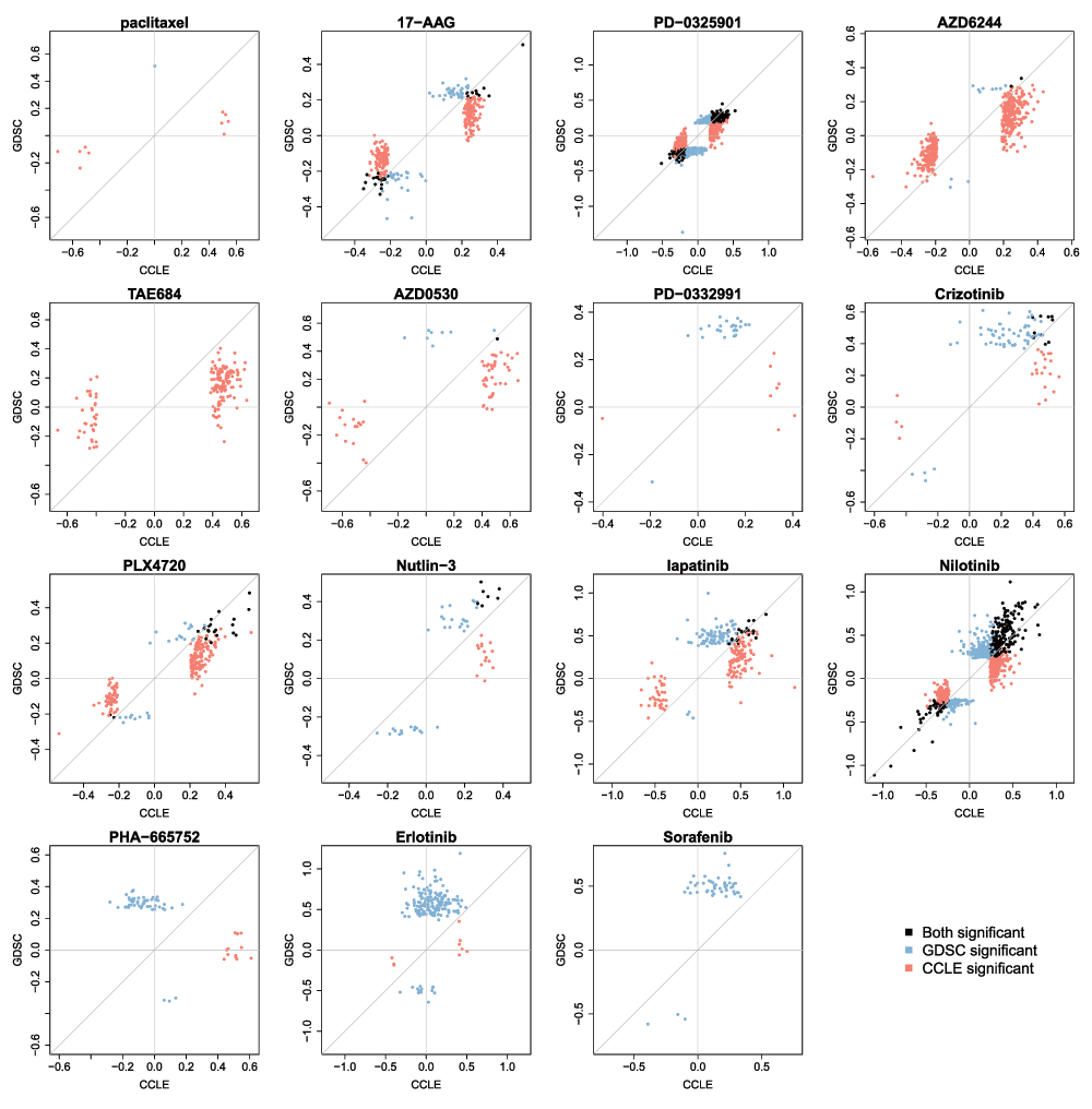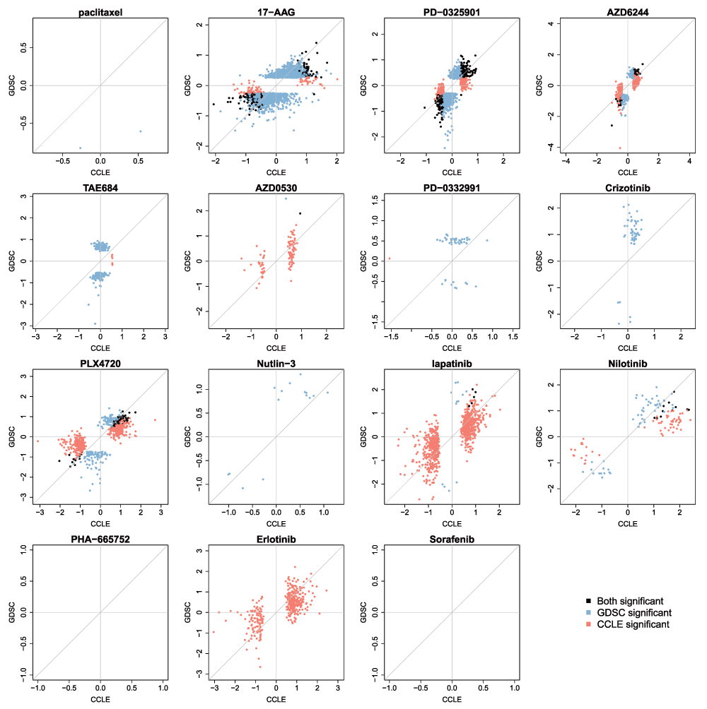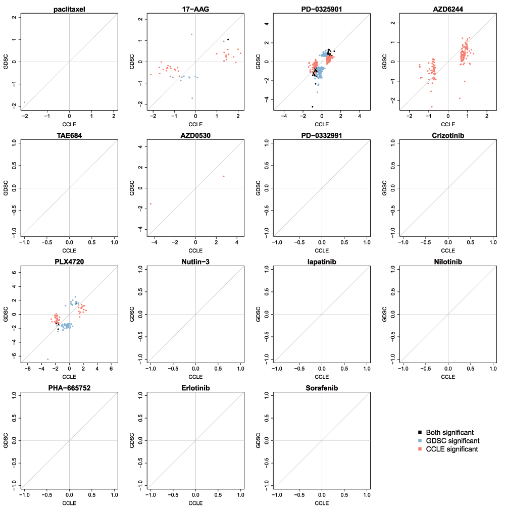 Presented with these two large studies, our hope was that we could use the data to identify new molecular biomarkers of drug response in one study that would predict response in the second. We3 and others4–6 reported difficulties in building and validating biomarkers of response using the GDSC and CCLE datasets, even when the analysis was limited to the drugs and cell lines screened in both studies. To understand the cause of this failure, we compared the gene expression profiles and the drug response data reported by the GDSC and CCLE7,8. We found that, although the gene expression data showed reasonable consistency between the two studies, the drug sensitivity measurements were surprisingly inconsistent. This inconsistency can be clearly seen by plotting drug response reported for each of the 15 drugs provided in both GDSC and CCLE for the 471 cell lines assayed by both studies7–10. Since the publication of our comparative analysis, we received a great deal of constructive feedback from the scientific community regarding multiple aspects of the analysis we reported, including suggestions for analytical methods that might uncover greater consistency between the studies. Moreover, both GDSC and CCLE have released new drug sensitivity and molecular profiling data, allowing us not only to revisit our initial analysis, but also to extend it using these new data.