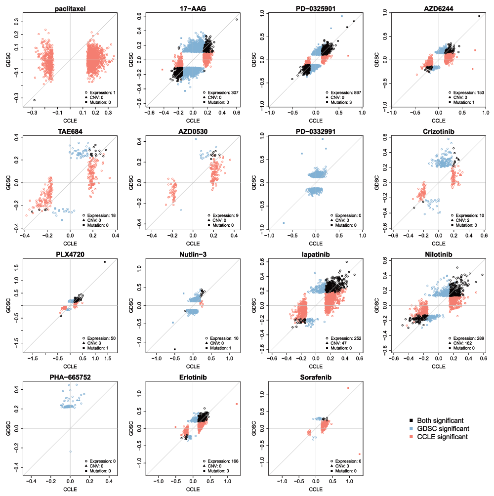 Discovering new biomarkers predictive of drug response requires both robust pharmacological data and molecular profiles. In our original study, we showed that the gene expression profiles for each cell line profiled by both GDSC and CCLE were highly consistent. However, we found that mutation profiles were only moderately consistent, a result that was later confirmed by Hudson et al.23.