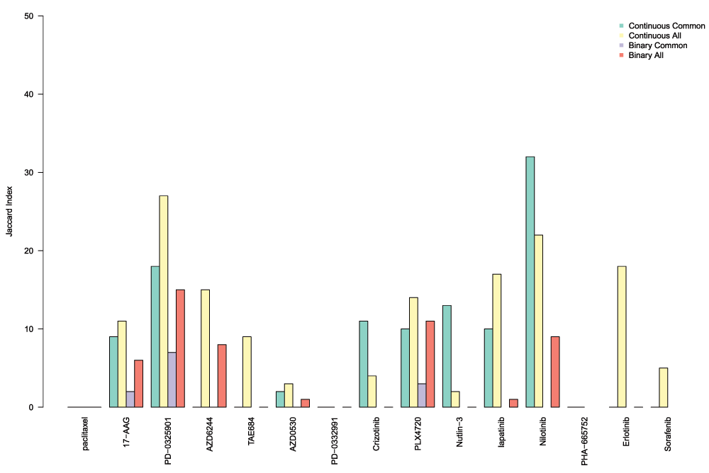 ’Continuous Common’ refers to the associations identified using continuous published AUC values on the common cell lines in GDSC and CCLE; ’Continuous All’ refers to the associations identified using continuous published AUC values on the entire panel of cell lines screened in each study; ’Binary Common’ refers to the associations identified using the discretized (binary) published AUC values on the common cell lines in GDSC and CCLE; ’Binary All’ refers to the associations identified using the discretized (binary) published AUC values on the entire panels of cell lines screened in each study.