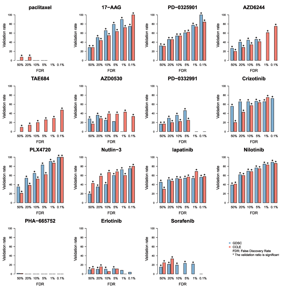 Gene-drug associations are identified using gene expression data and continuous published AUC as input and output of a linear mode, respectively. The symbol ’*’ represents the significance of the proportion of validated gene-drug associations, computed as the frequency of 1000 random subsets of markers of the same size having equal or greater validation rate compared to the observed rate.