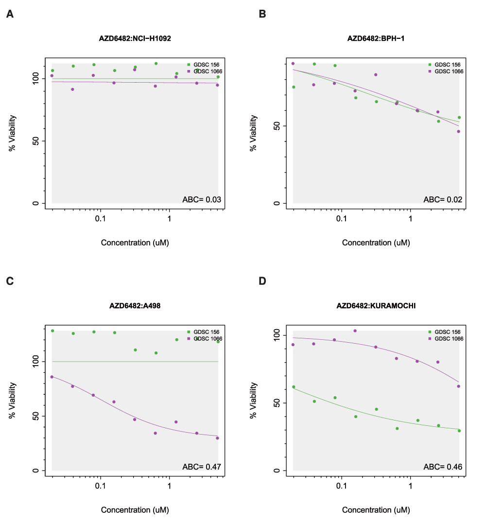 Examples of (A,B) consistent and (C,D) inconsistent replicated experiments screening AZD6482 in GDSC. The grey area represents the common concentration range between studies. (A) NCI-H1092; (B) BPH-1; (C) A498; and (D) KURAMOCHI cell line treated with AZD6482.