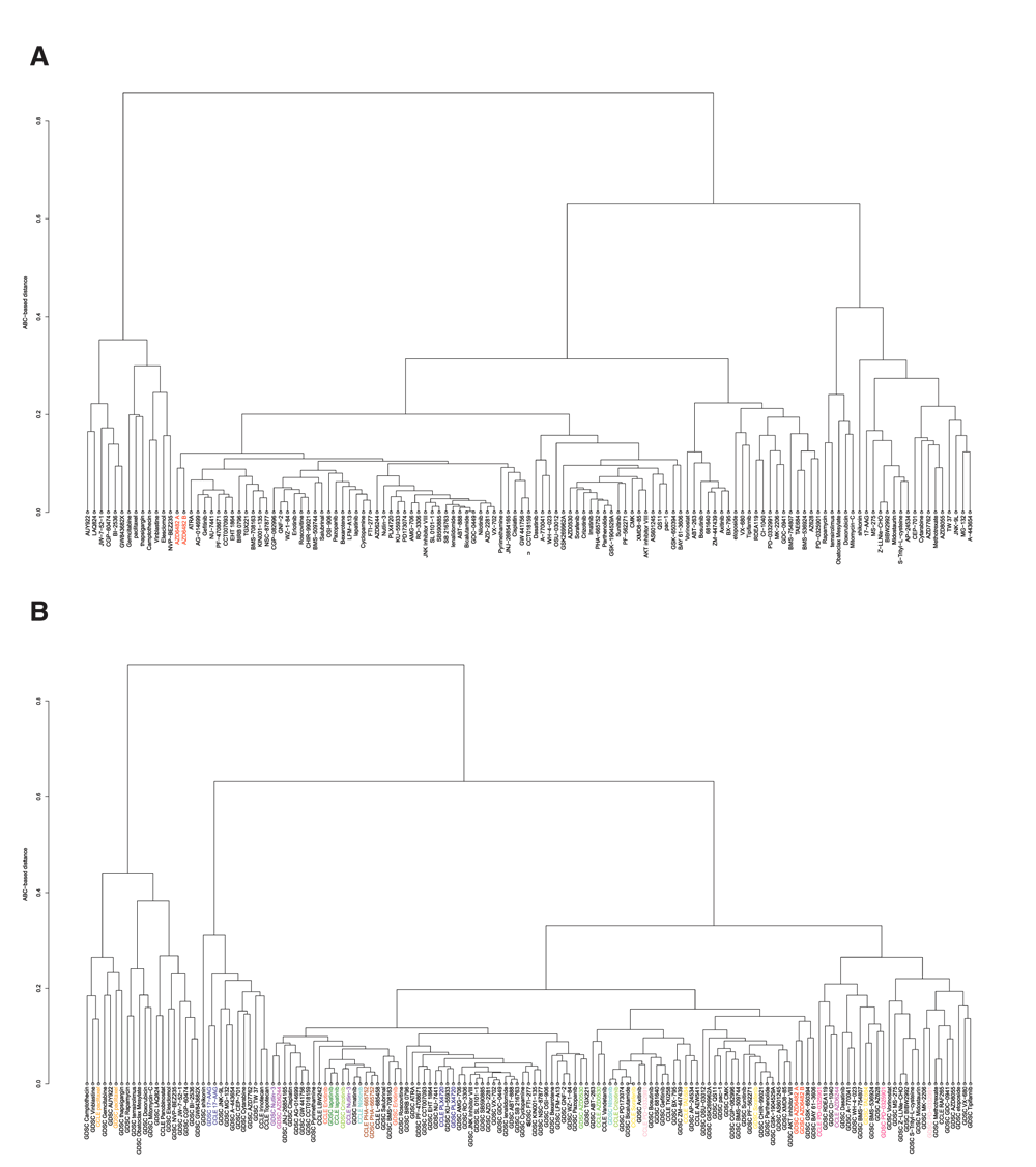 (A) Dendrogram of the clustering of all drugs in GDSC based on their mean ABC values. (B) Dendogram of the clustering of all drugs in CCLE and GDSC based on their mean ABC values, overlapped drugs are shown with the same colour.