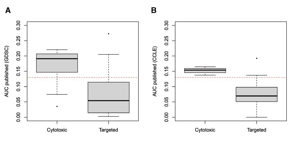 Comparison of median absolute deviation (MAD) of published AUC values between cytotoxic and targeted drugs using all cell lines in (A) GDSC and (B) CCLE.
