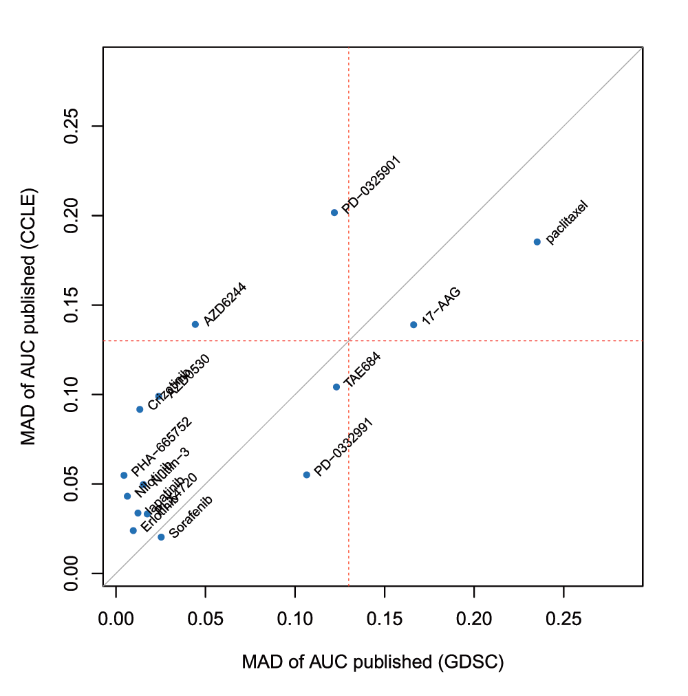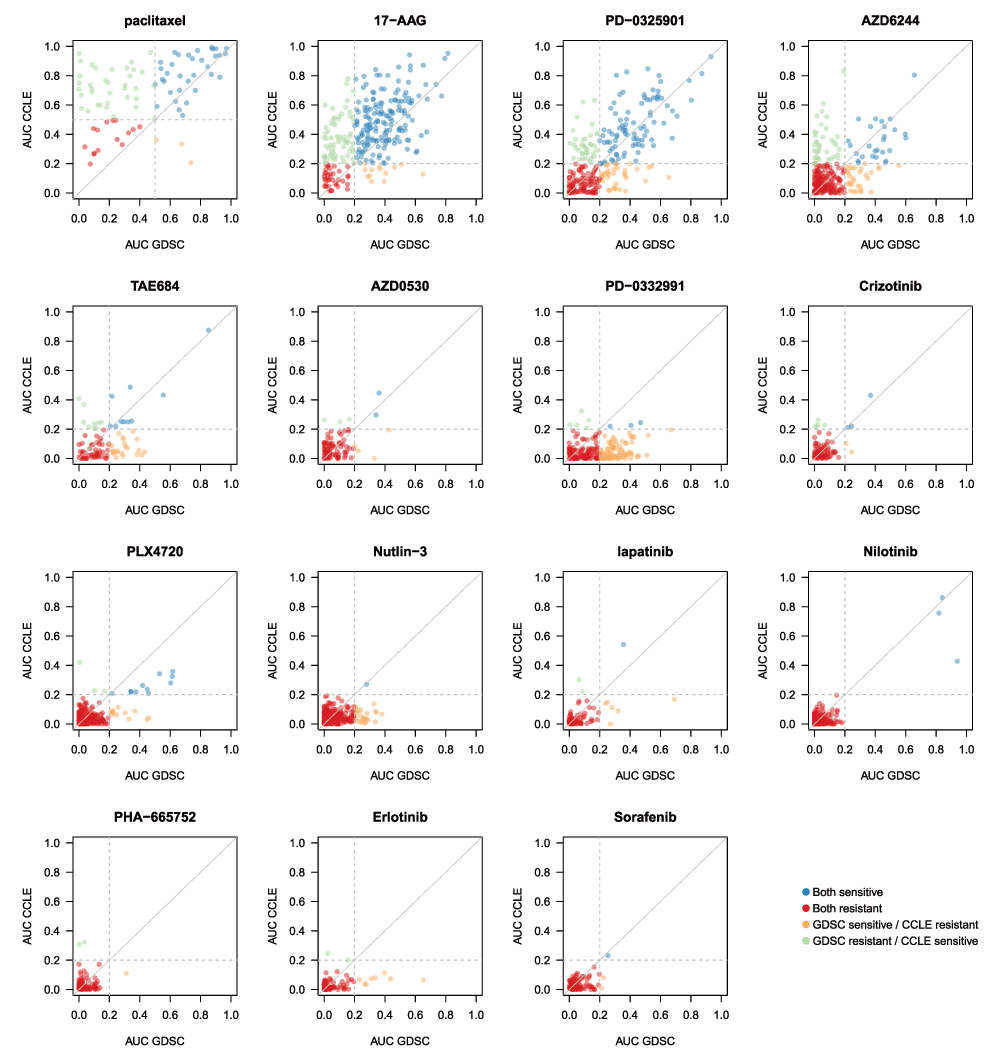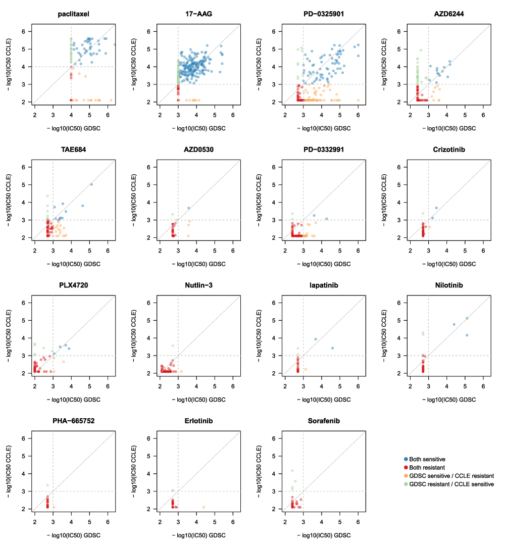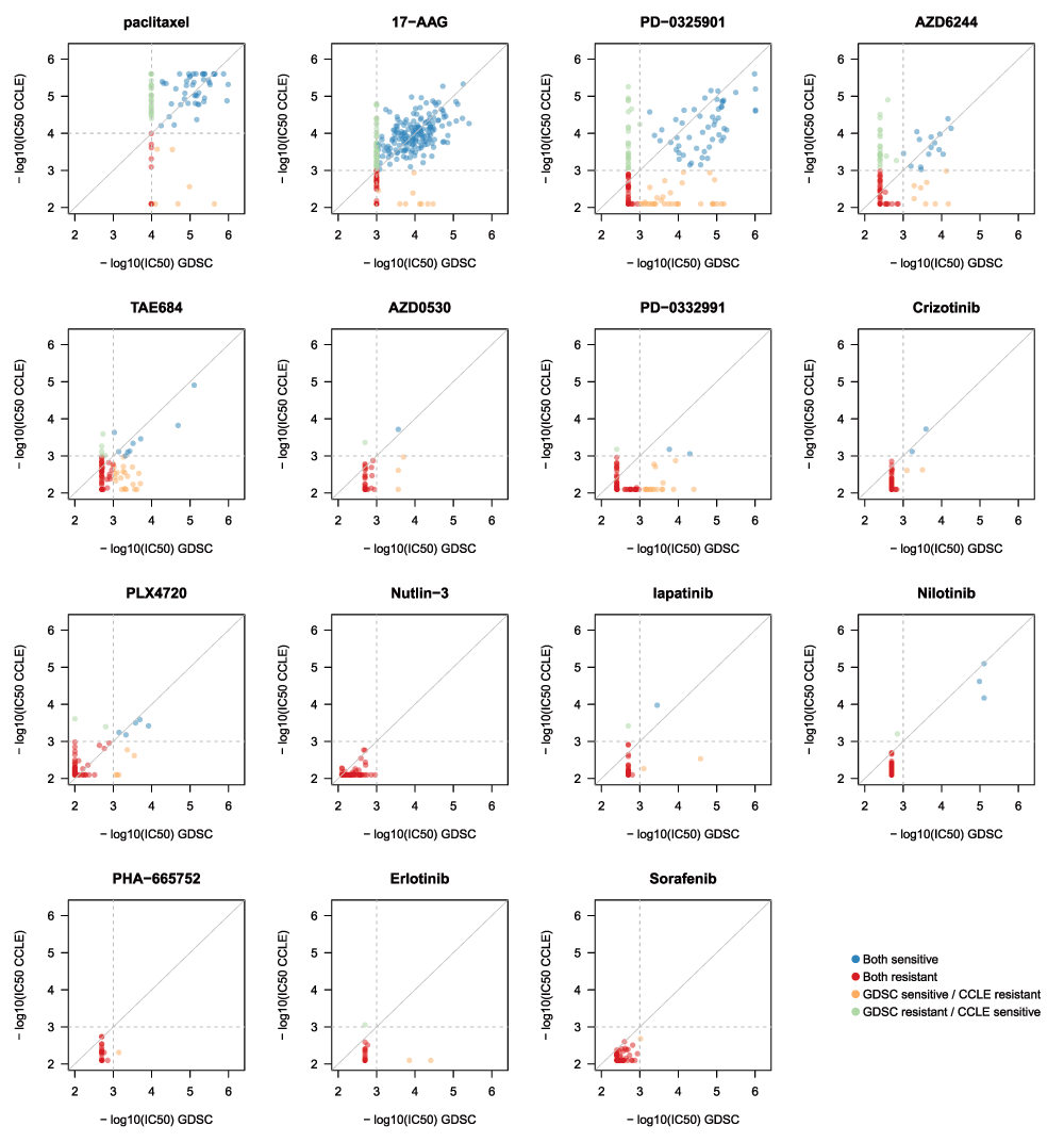 Unexpectedly, when we compared phenotypic measures of drug response that were released by the GDSC and CCLE projects, we found discrepancies in growth inhibition effects of multiple anticancer agents. What that means in practice is that, for some drugs, a molecular biomarker of drug response learned from one study would not likely be predictive of the reported response in the other. And consequently neither of the studies might be useful in predicting response in patients as many had hoped when these large pharmacogenomic screens were published.