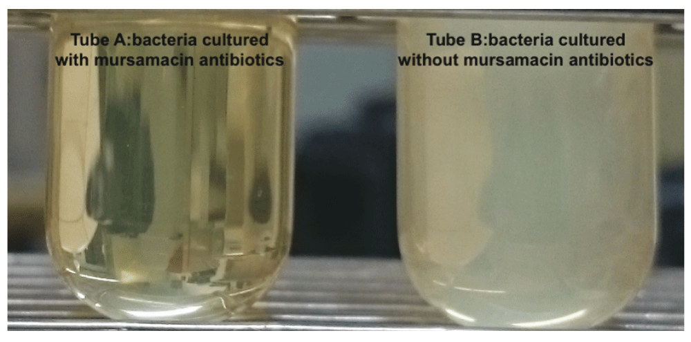 MRSA cultures were incubated with (tube a) and without (tube b) mursamacin antibiotics respectively. A clear tube denotes no bacterial growth while turbid tube denotes bacterial growth.