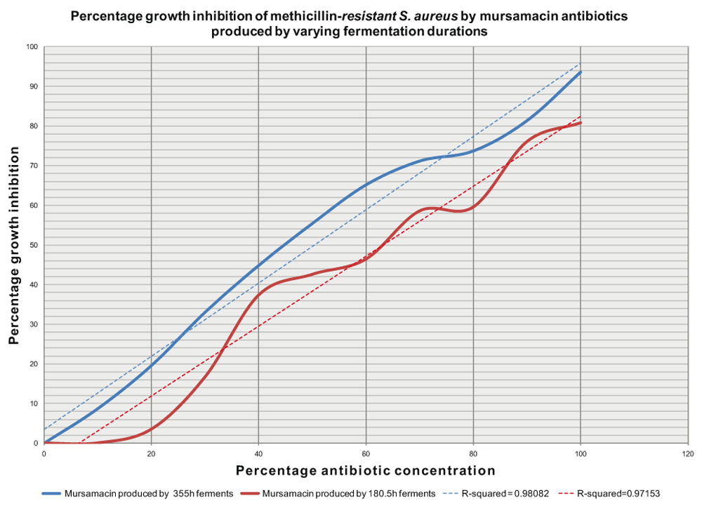 The longer fermentation duration (355 h) produced antibiotics that were generally more inhibitory to methicillin-resistant S. aureus. Dotted line graphs represent linear equations derived from the raw inhibition values. The high R-squared values demonstrate that the concentration of the antibiotic was predominantly responsible (97–98%) for the level of percentage growth inhibition.