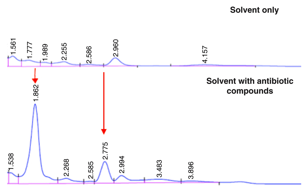 Top chromatograph represents the solvent only while bottom chromatograph is of solvent containing organic mursamacin antibiotics. Two dominant compounds, indicated by the red arrows, were detected in this fraction.