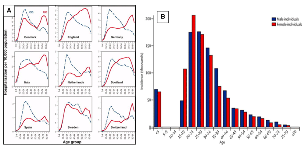 It is important to consider the age distribution at which patients present with Crohn’s disease. It rises to a peak at between 20 and 30 years of age after which it demonstrates a steady decline, a pattern that is remarkably consistent, and very different from that of UC, across the geographical spectrum97,172–174.