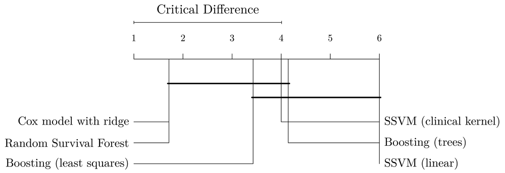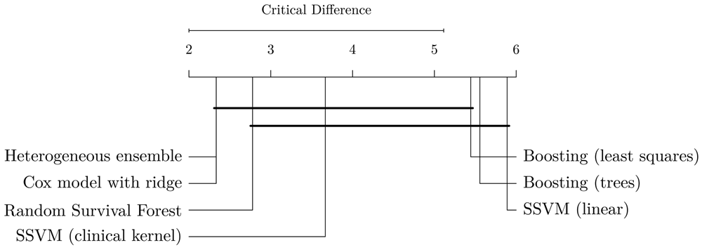 In the second experiment, training and test data were from separate trials, which resembled the setup of the Prostate Cancer DREAM Challenge. We included heterogeneous ensembles in the analyses, trained on a library of models that included multiple copies of each survival model, each with a different hyper-parameter configuration. The library excluded linear SSVM, because it performed poorly in previous experiments, and Cox’s proportional hazards model, because its Newton-Rhapson optimization algorithm used a constant step size instead of a line search, which occasionally led to oscillation around the minimum during ensemble selection. We investigated whether the observed differences in performance are statistically significant by performing a Nemenyi post-hoc test34 based on the results of all train-test-set combinations in Figure 3. Figure 5 summarizes the results.