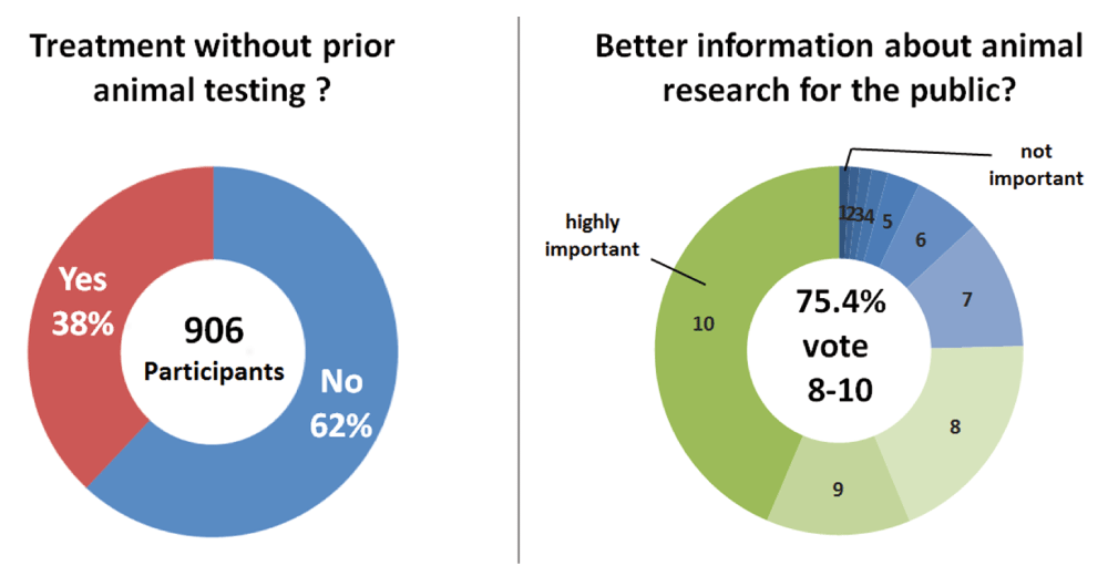 A total of 906 participants responded to the survey, resulting in a response rate of 6.38%. Participants were 36.5% staff members and 63.5% students, of which 43% previously had personal experience with animal experiments. The relevance of animal models for research was rated high (8–10 on a scale 1–10; 1 being lowest) by 82.8%, and 62% would not accept a treatment without prior animals testing (Figure 1, left). These results were similar to a 2011 Nature poll4 with 980 participants and a 2014 survey by the American Association for the Advancement of Sciences5. In our cohort, participants rated the society’s acceptance of animal research low (4.24 ±1.77, scale 1–10; 1 being lowest) as well as the current communication to the public on medical advances derived from animal research (4.37 ±2.22, scale 1–10; 1 being lowest). Consequently, 75.4% believed the public should receive better information about the benefits, necessities and legislation of animal experiments (Figure 1, right).