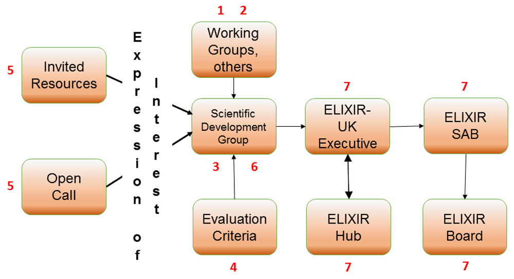 ELIXIR nodes need to be able to evolve their contributions to ELIXIR by bringing new services and resources. ELIXIR identifies two types of service: Node-funded services, which are funded nationally and are contributed to ELIXIR from a national Node; and Commissioned Services, which are funded by ELIXIR as a whole via the ELIXIR Hub. In some ELIXIR Nodes, Node-funded services receive funds through their national Nodes; in the case of the UK’s Node, ELIXIR-UK, resource funding is through direct grant funding to resources and services from the national funders. In ELIXIR terms, these are still labelled as “Node-funded”. The process described in the present article was set up to identify Node-funded services and resources for ELIXIR-UK. ELIXIR sets high standards for the services it provides. Consequently, nodes need to take full account of these requirements when selecting and proposing their services, which are ultimately judged for suitability by the ELIXIR Scientific Advisory Board (SAB) and Board of ELIXIR (see the online ELIXIR Handbook for more detail).