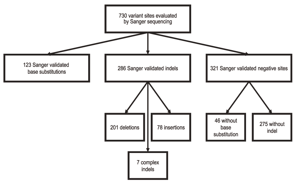 We considered a site negative for a base substitution if the specific base substitution was not present, resulting in 46 negative base substitution sites. We considered a site negative for an indel if no indel, of any kind, was detected in the sequencing trace, resulting in 275 negative indel sites. We annotated confirmed variants with the HGVS-compliant CSN standard using CAVA (version 1.1.0) according to the transcripts designated in Supplementary table 17. There were 123 confirmed base substitution variants and 286 confirmed indel variants (Figure 1, Supplementary table 1).