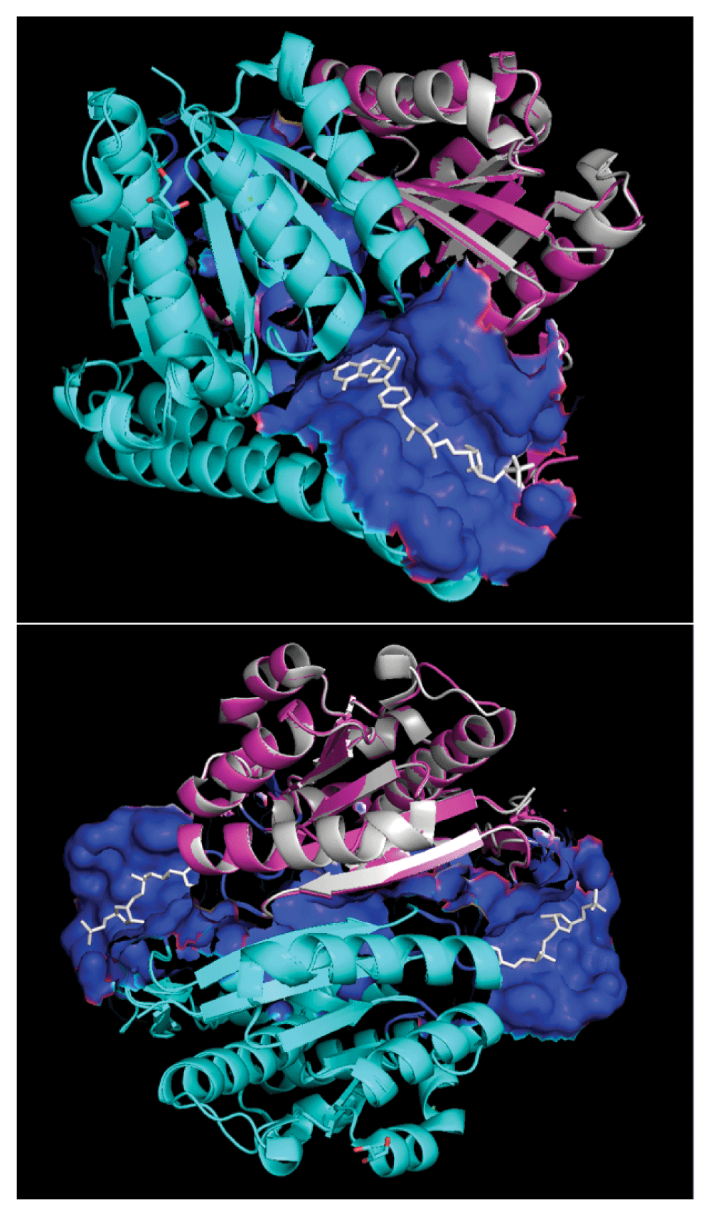 Modeled quaternary structure of A5UMI1/3IQZB (cyan) and A5UMI1/3IQZF (pink) after respective alignments onto chain-B and chain-F of 3IQZ within PyMOL28. 3IQZ’s chain-F is highlighted in silver. Dual chain model site residues (blue surface) were inferred from residues in chain-B and chain-F models that are within 7 Å of the 3IQZ ligand (H4M - white). 3IQZ’s chain-B and chain-F form a quaternary structure with two different H4M binding sites (bottom).