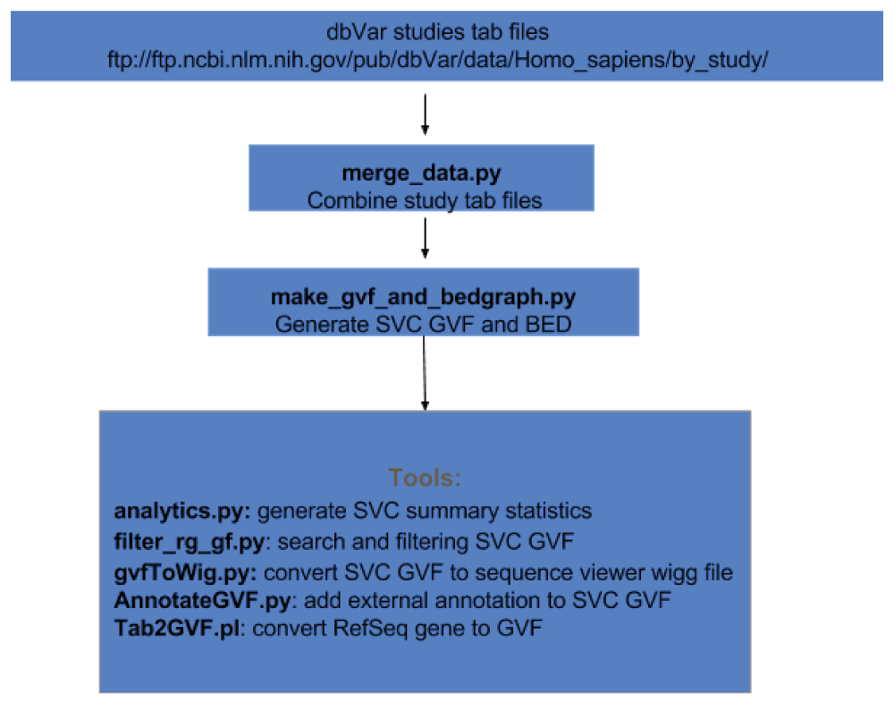 Figure 2 demonstrates the workflow for this analysis. dbVar SSV data by studies were obtained in tab delimited format from the FTPsite (ftp://ftp.ncbi.nlm.nih.gov/pub/dbVar/data/Homo_sapiens/by_study/) and used as input. The study files were combined and sorted by chromosome positions into a single file using the script merge_data.py. SVC regions, including counts as shown in Figure 1, were generated from the merged file using the script make_gvf_and_bedgraph.py, which output SVC GVF and BED files. Since the approach in Figure 1 is similar to finding consensus regions or overlapping features between aligned reads make_gvf_and_bedgraph.py use HTSeq.GenomicInterval class to store SSV chr. start, and stop coordinates as genomic features and the HTSeq.GenomicArrayOfSets class to identify overlapping positions to generate SVC and counts.