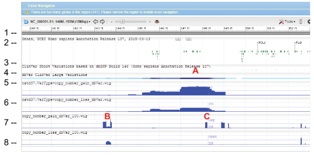 WIG files were generated from SVC GVF files to allow loading into sequence viewer for quick visual inspection as shown in Figure 3. The SVC sets used for inspections are the combined-set which includes 1000Genomes6, as well as other large studies to provide frequently occurring or “common” SVC to compare with presumed curated variants that have clinical significance from study-set (dbVar:nstd37) submitted by ClinGen7. The Variation Viewer8 allows for quick navigation by genes, chromosome positions, and variations for visual comparison (Figure 3, Figure 4, and Figure 5). Figure 3 and Figure 4 show a hotspot peak A in ClinVar (track 4) that corresponds with a peak in SVC from nstd37, suggesting that this region is critical for function and that variations in this region are rare. These conclusions are supported by the lack of corresponding SVC peaks in the combined-set “common” tracks 7 and 8. However, tracks 7 and 8 also contain peaks B and C that flank the ClinVar peak, which may demarcate the boundaries for the critical region peak A. In contrast, Figure 5 shows that there are corresponding SVC peaks in the nstd37 (rare) and in the combined-set (common), suggesting that variants in this region may have minimal or no clinical impact by themselves.