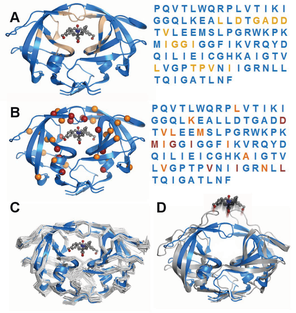 HIV-1 protease has become a model system because of its disease relevance, the availability of mutational and drug binding data, and for its tractable size and molecular stability. The protein’s function is to cleave HIV peptides into the functional proteins of the infectious HIV virion. This example illustrates generalized concepts of the applicability of protein modeling methods in clinical investigations A) Ligand binding residues are spatially separated. The functional protein dimer is shown with a pharmacologic inhibitor bound to the active site. Residues that are within 3.5Å of the inhibitor are highlighted in tan. The primary sequence is colored identically to the three-dimensional structure to indicate relative positioning of residues. It is apparent that the ligand binding portion of the protease consists of residues that are non-adjacent within the primary sequence, which illustrates an advantage of modelling over linear sequence analysis. B) Drug resistance mutations tend to occur in residues within the active site. Many mutations have been characterized that are associated with resistance to inhibitor drugs. While the sites of these mutations are also disjoint in sequence, nearly all of them fall into the same set of drug binding residues, indicating how modeling can enable prediction of a mutation’s effect. C) Structural effects of mutations beyond the active site. Drug-resistance mutations in non-ligand-binding residues have been shown, using computational experiments, to impact the flexibility of the protein and therefore alter drug binding. Computational modeling has characterized the flexibility of the protein in multiple mutated states, illustrating the potential to predict the functional effect of mutations beyond an active site. D) Dynamics of ligand-free protein. Computational studies have the advantage of being able to simulate conditions that are difficult to assay experimentally, such as the dynamics of ligand-free forms in atomic detail.