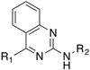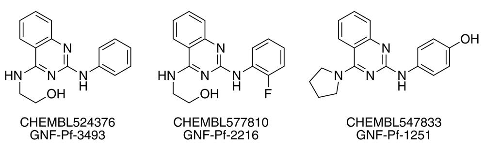 For Workflow 1, six of the 73 new compounds were tested previously in anti-malaria activity assays found in ChEMBL-NTD (https://www.ebi.ac.uk/chemblntd/) and PubChem (https://pubchem.ncbi.nlm.nih.gov) and three of them were found to be active. Three main scaffolds covered 25 of the 73 compounds: thiazolidin-4-one-type, 8-hydroxyquinoline-type, and aminopyrimidine-type scaffolds (Table 6). The compounds with the thiazolidin-4-one-type scaffold were the largest group. The scaffold can be seen as a variation of compound SJ000154494 (Figure 3), but the compounds in this group were mostly inactive. In addition, the scaffold may be a potential PAINS substructure due to its similarity with rhodanine, although it is currently not part of the filters28. The 8-hydroxyquinoline scaffold is a phenolic Mannich base, which is a PAINS substructure. The most interesting scaffold is the aminopyrimidine-type with a second N-alkyl substituent instead of a known N-aryl substituent. The most active compound of this series, SJ000866807, exhibits a good ligand efficiency with an EC50 of 0.2 μM and a molecular weight of only 266 g/mol. From this series of compounds only one (SJ000866811) was listed in PubChem, but this was in an assay for anti-cancer activity (AID 743276). However, similar compounds were previously reported in the Novartis-GNF Malaria Box40 (Figure 4).