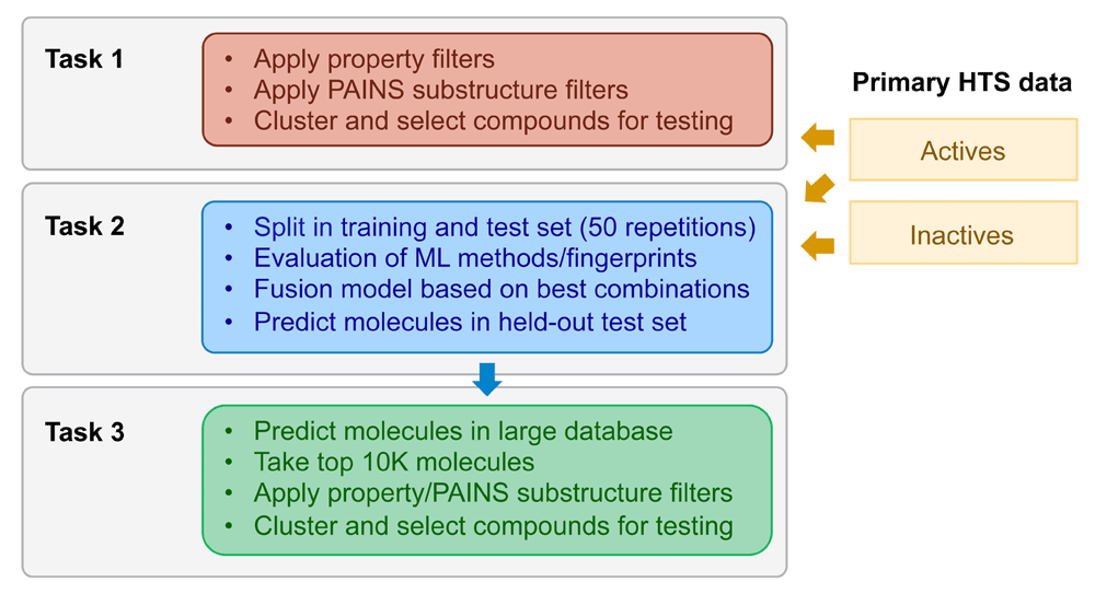 To triage the hit list in the first task, property filters (Table 1) based on previously described filters26,27 were applied for in silico post-processing of the primary HTS data, which resulted in 1512 remaining active compounds.