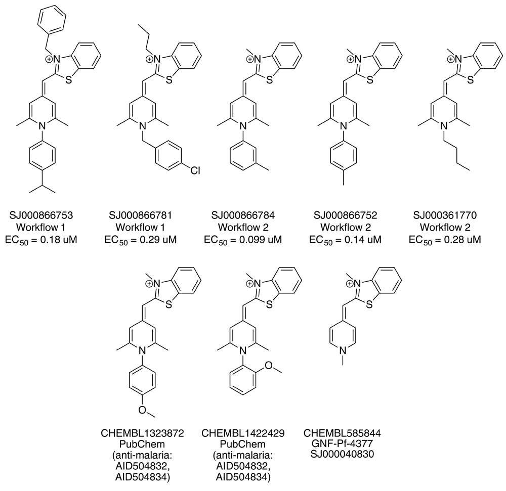 From the combined set of 2000 candidates predicted by Workflow 1 and Workflow 2, 114 were tested in a follow-up assay (80 from Workflow 1 and 38 from Workflow 2, four compounds were predicted by both Workflows). The identifiers, SMILES, EC50 values and raw data for all 114 compounds are given in the Supplementary material. Of these, two were known anti-malarials (quinidine and amodiaquine) selected as positive control. In addition, 31 compounds (six from Workflow 1 and 28 from Workflow 2, three were in common) were already present in the primary HTS and confirmatory screen provided by the TDT challenge, as such molecules were not explicitly removed from the eMolecules catalog before the virtual screen (Supplementary Table S1). One of these compounds, SJ000154494 (Figure 3, EC50 = 0.44 µM as measured in this study) was found inactive in the previous primary screen and confirmatory screen23, which was likely a false negative in the latter screen because dose-response testing immediately following the primary screen was done using compounds from stock solutions ranging in age, whereas the current experiment was performed on fresh powder.