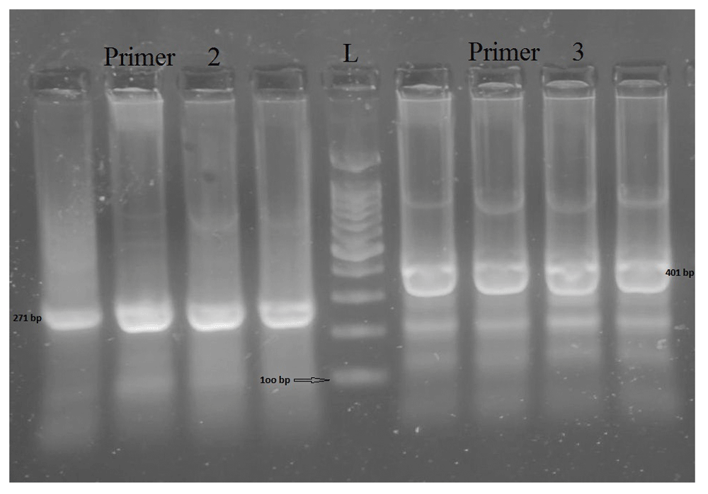 Left-side, PCR amplicons of primer 2, size 271 bp; right-side, PCR amplicons of primer 3, size 401 bp; L, ladder of 100bp each.