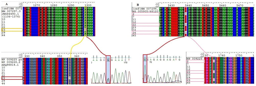 (A) Heterozygous substitution from Glutamine (Q) to Arginine (R) at position 356 in patient 23, due to missense substitution mutation from Adenine (A) to Guanine (G) c.1299A>G, coding sequence. (B) Heterozygous substitution from Valine (V) to Aspartic acid (D) at position 1736 in patients 2, 22 and 26 due to missense substitution mutation from thymine (T) to adenine (A) c.5439 T>A coding sequence. Using the transcript variant 1 NM_007294 mRNA, which represents the complete BRCA1 coding sequence used to align all patient sequences under screening, and the corresponding amino acid sequences NP_009225 to align all patient translated amino acid sequences.