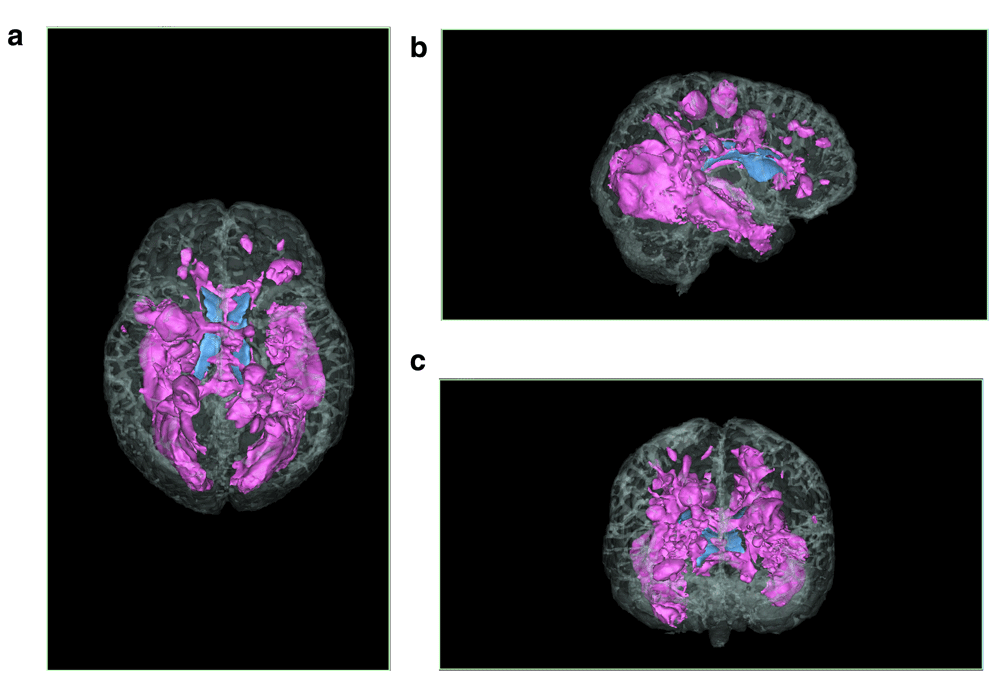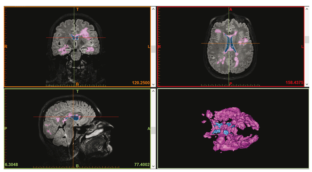 Ventricles are shown in blue and white matter lesions are depicted in pink.