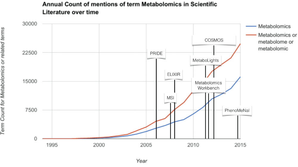 The field celebrated its coming of age in 20161 and progressed primarily through developments in analytical and computational tools, from which biomedical discoveries followed. As shown in Figure 1, the term ‘metabolomics’ is still gaining momentum and the global market for metabolomics was valued at $5.9 billion in 2014 and was expected to reach $12.5 billion by 2020, with a compound annual growth rate (CAGR) of 13.0% (https://goo.gl/yXTiJD). The future is bright for the application of metabolomics in academic and industrial laboratories, scientific instrument companies, government laboratories and contract research organisations. Yet, several challenges remain. Discussions amongst both independent metabolomics experts, and those within ELIXIR (http://elixir-europe.org/), culminated at the recent workshop the “Future of metabolomics in ELIXIR”. This opinion article summarises the interactions in the workshop and its outcomes.