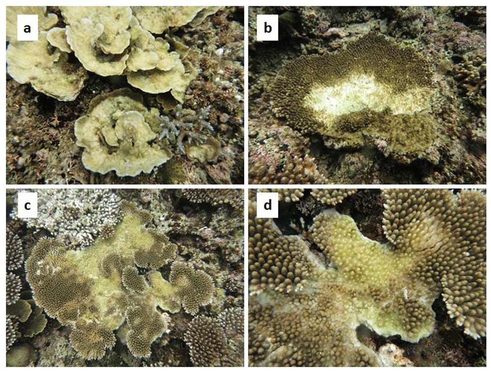 (a) Dead and dying Montipora aequituberculata colonies (b) Acropora hyacinthus colony with bleached and dying tissue in the middle of the colony (c) a second A. hyacinthus colony (d) close up of the colony in (c).