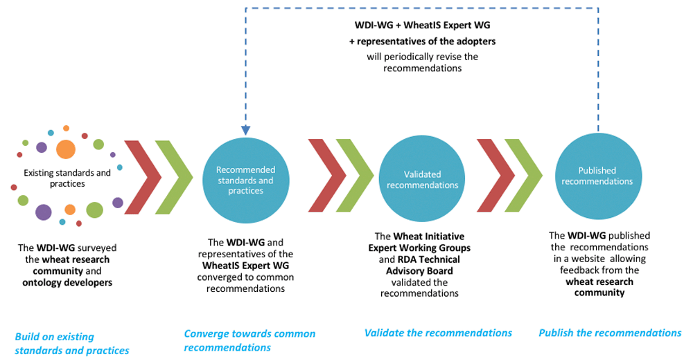 To help address these debts, the Wheat Data Interoperability Working Group (WDI-WG, https://www.rd-alliance.org/groups/wheat-data-interoperability-wg) was created as one of the Research Data Alliance working groups (https://www.rd-alliance.org/groups), under the umbrella of the WheatIS Expert Working Group (http://wheatis.org/), which is endorsed by the IWI to build an international information system for wheat genetic, genomic and phenotypic data. The Working Group included wheat scientists, as well as ontologists and data experts from different organizations and countries, and its mission was to provide a common framework for describing and representing data with respect to existing open data standards. From the outset, the objective of the WDI-WG was to deter communities from creating new standards, which would have made the already-complex landscape of existing data standards even more complex. The WDI-WG collected valuable information through two surveys of the wheat research community, comprising responses regarding existing data formats, practices, and the use of ontologies and controlled vocabularies. From these surveys, the WDI-WG then developed a set of specific recommendations, and worked to facilitate data interoperability through the harmonization of data formats, data models and vocabularies usage, thus aiming to address the main interoperability issues. The proposed recommendations have been endorsed by the WheatIS Expert Working Group and the Technical Advisory Board of the RDA (RDA-TAB).